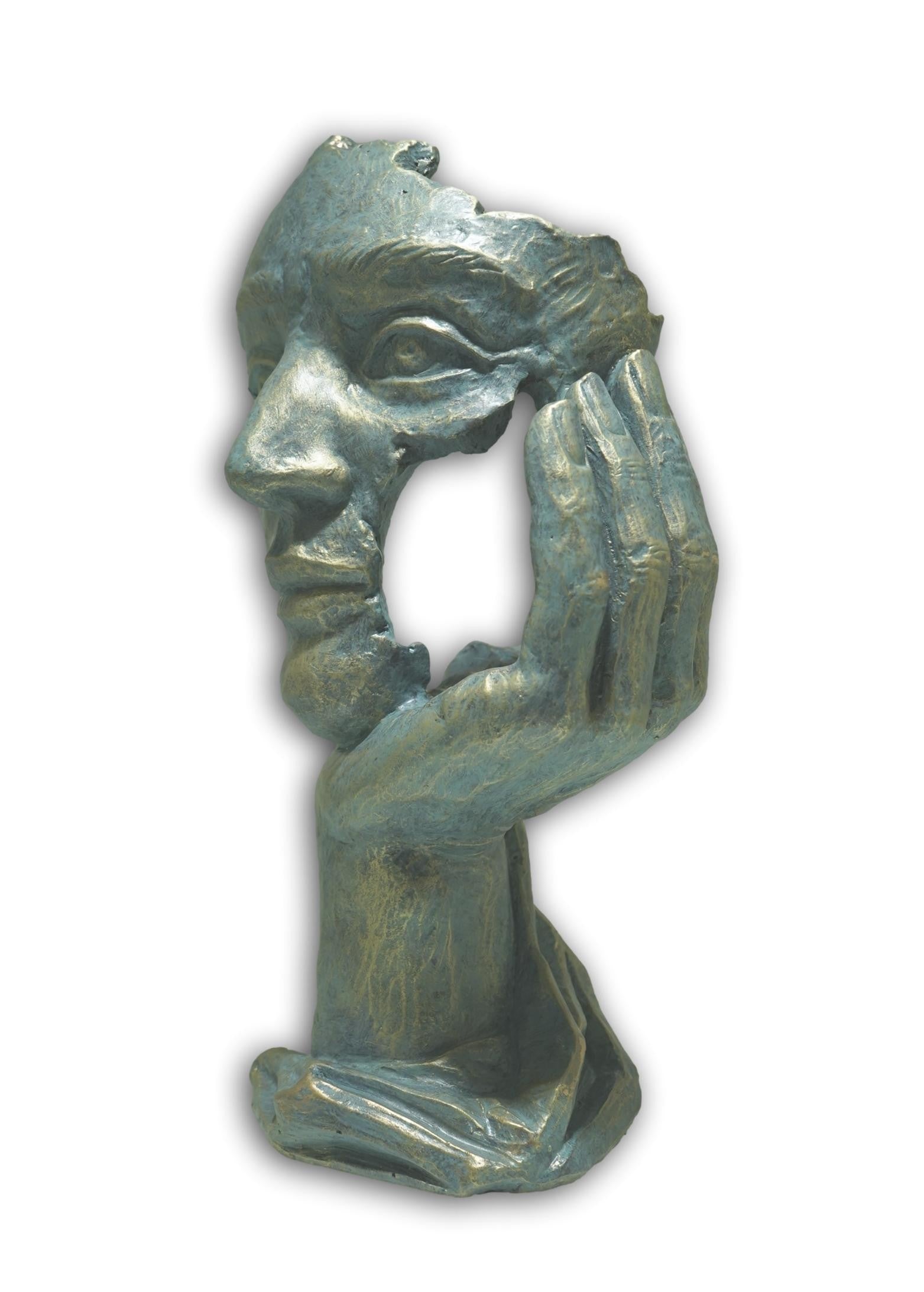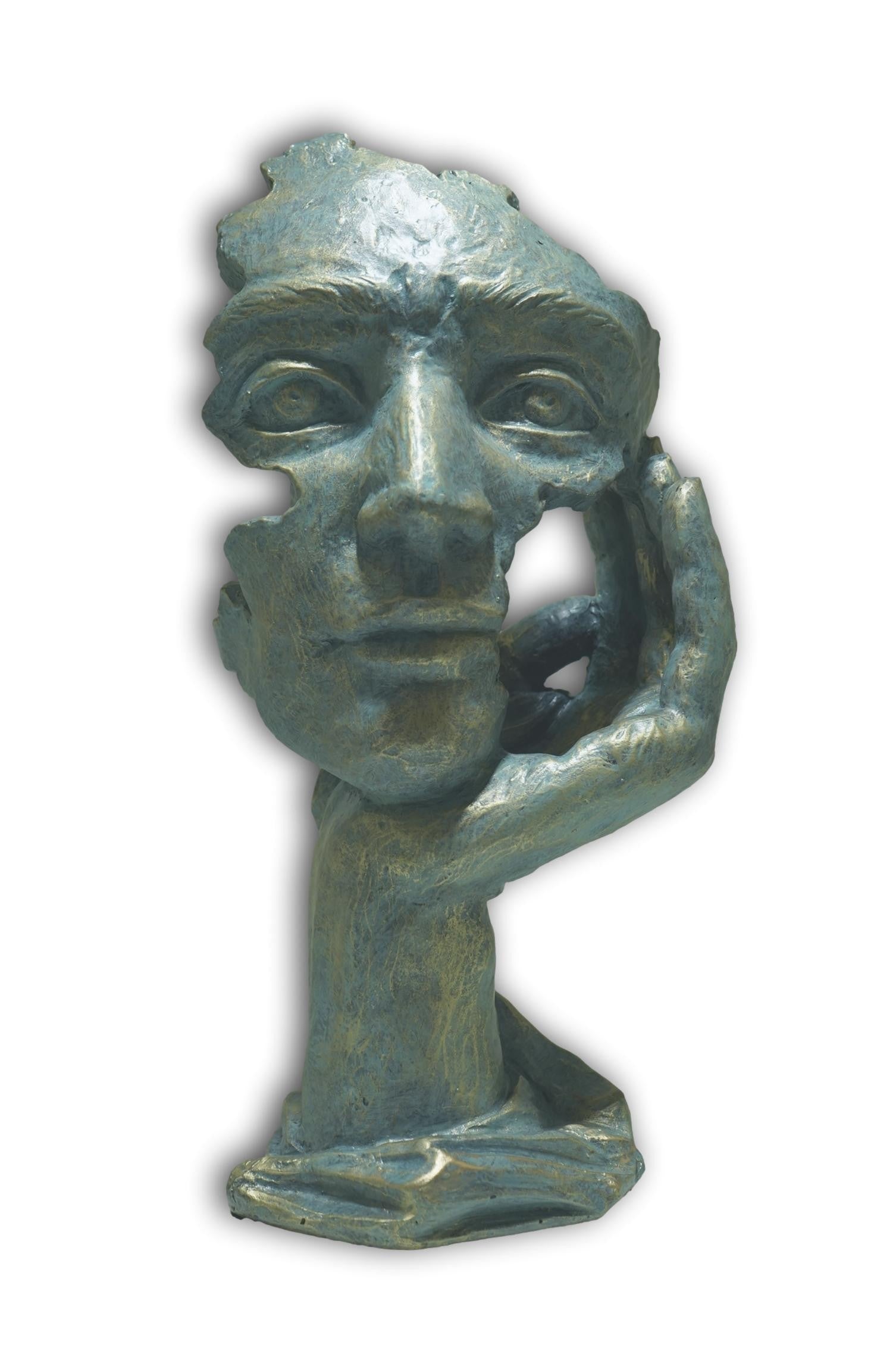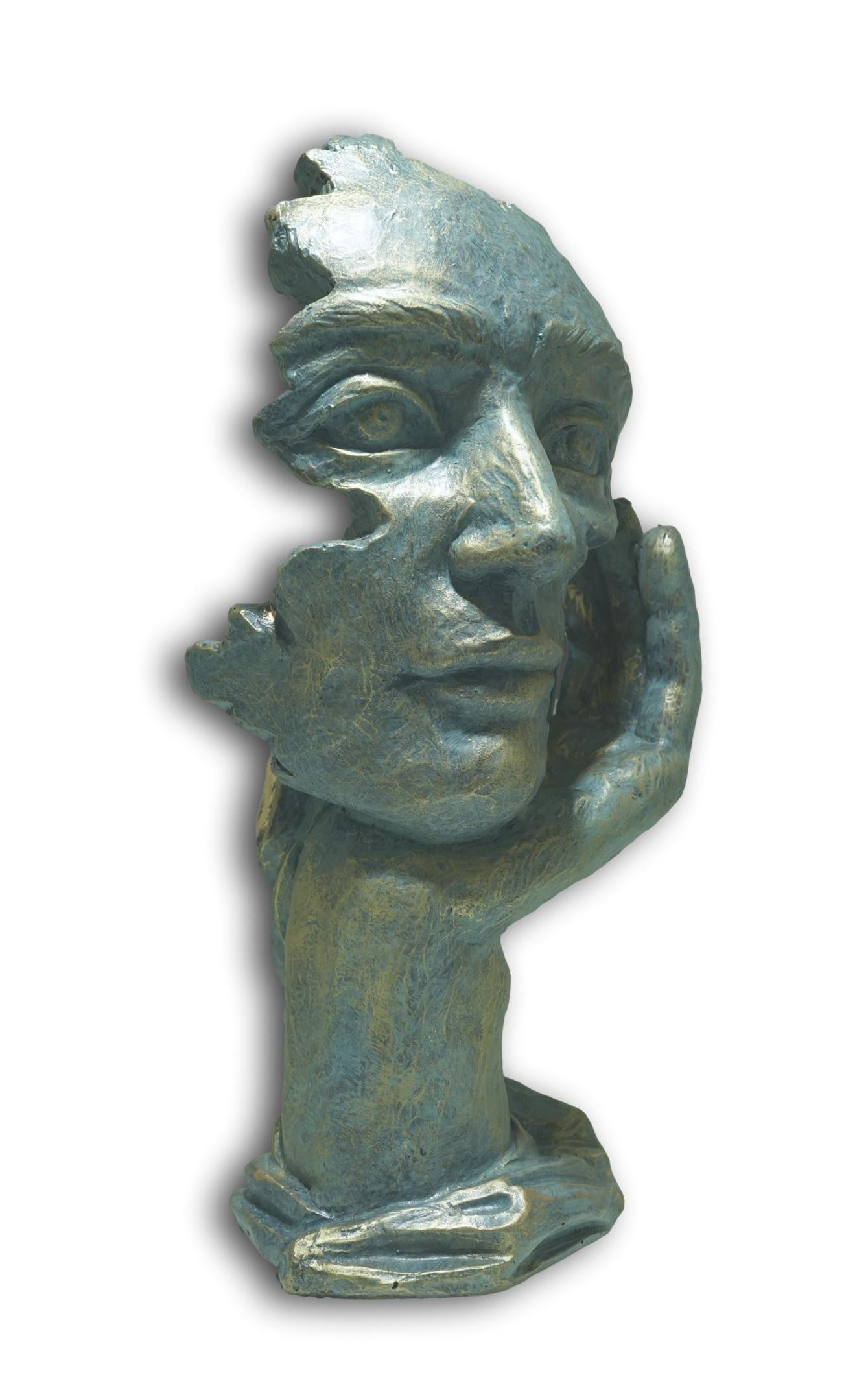 This is a contemporary sculpture depicting a pensive female face. The sculptor plays with shapes and creates the base of the piece from the figure's arm and hair. The woman depicted here stands out for her serene expression and her gaze lost in the distance, conveying the sensation of being immersed in deep thought.
