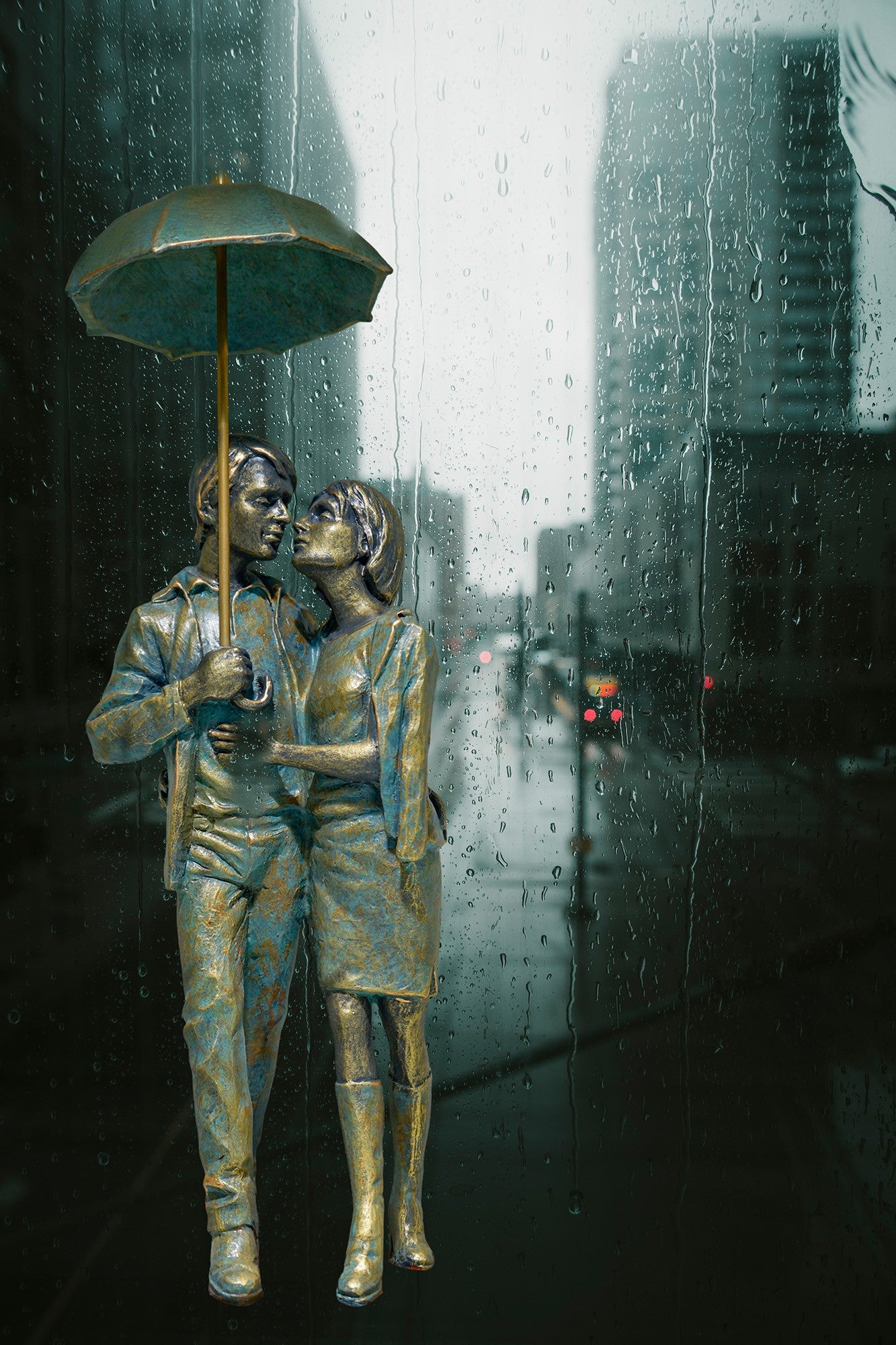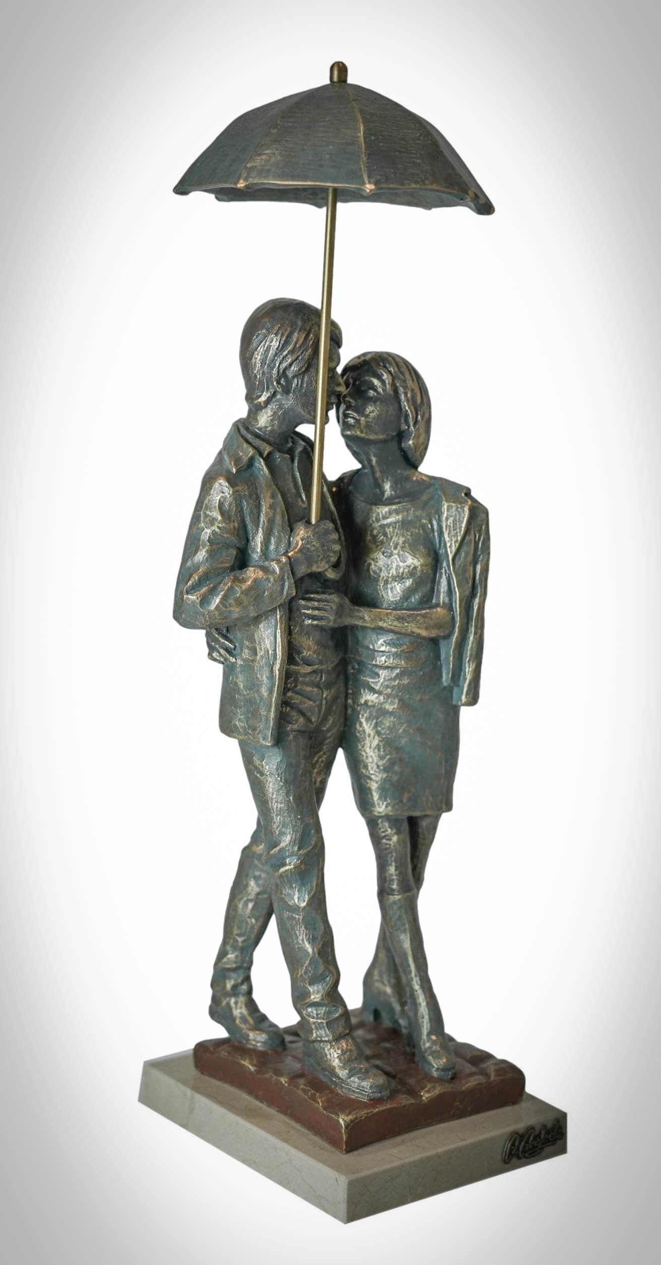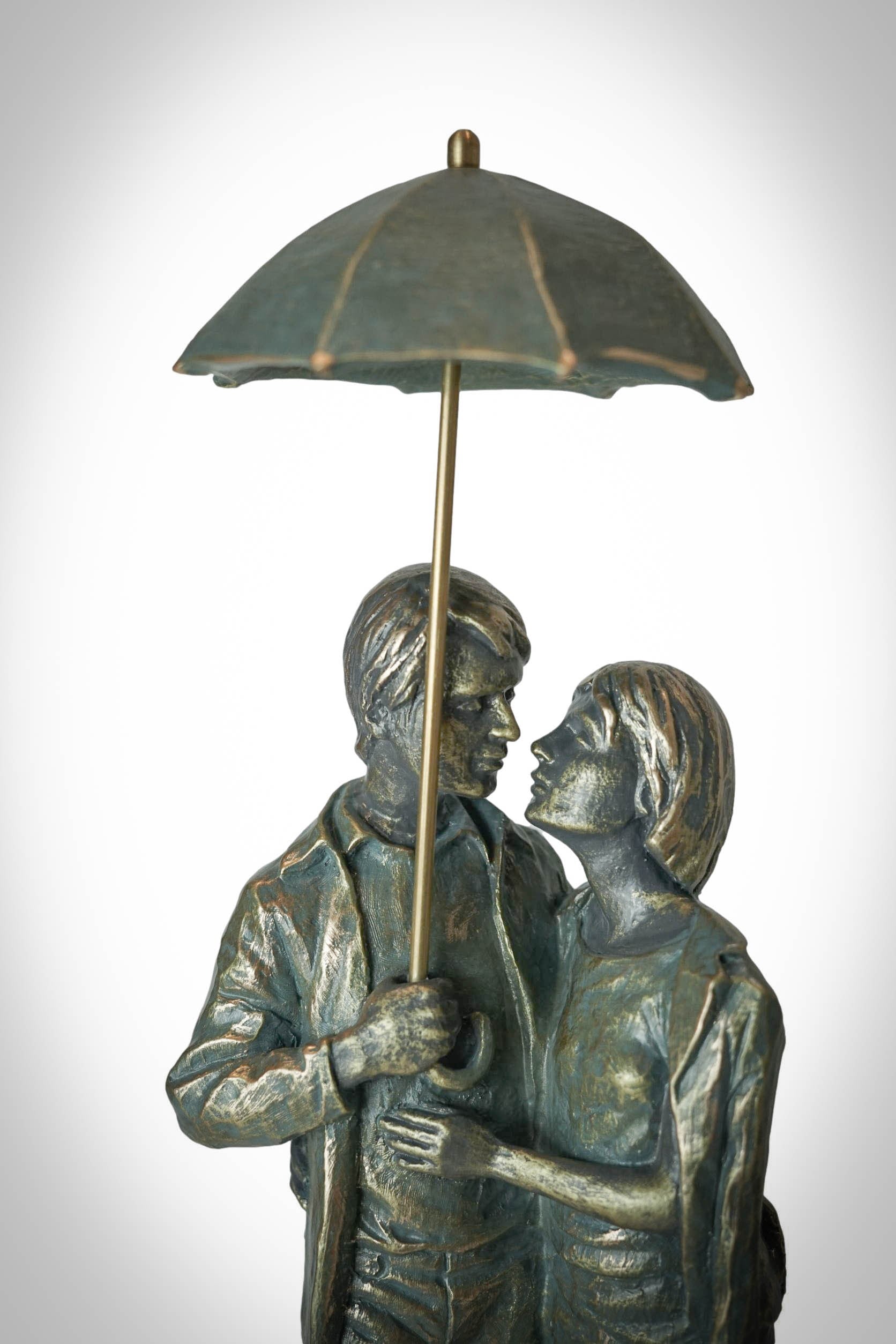 This sculpture of a couple represents what is possibly the most romantic time of year: autumn. The season that brings us the first cold snaps of the year, accompanied by rain and a certain touch of melancholy. But these two figures in the sculpture don't seem to mind in the least. They remain blissfully unchanged, and inclement weather is no problem as long as they are together. This realistic sculpture is a perfect representation of love that could make an original wedding gift .