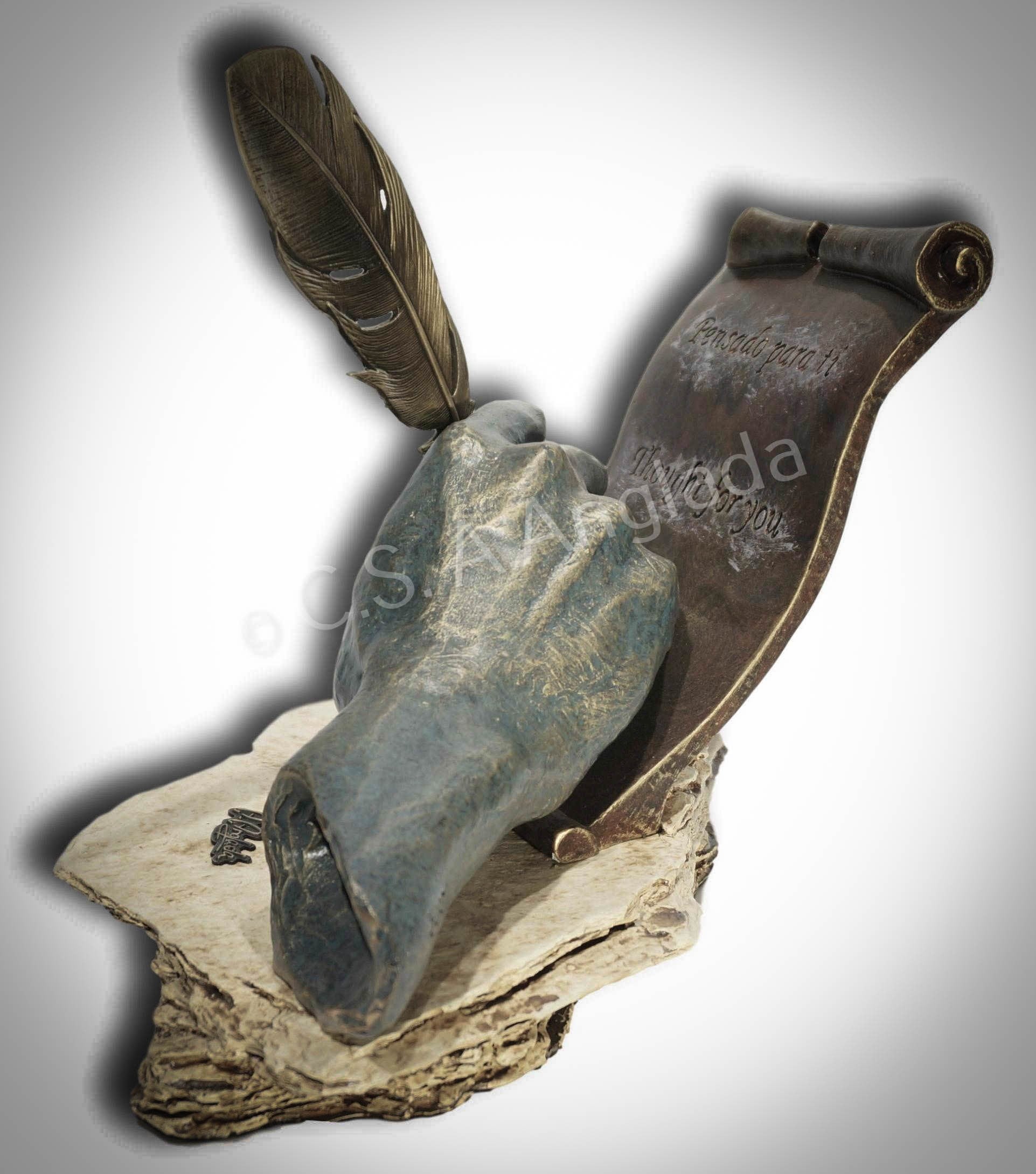 Mano escribiendo sobre un pergamino con pluma de avestruz, acabados bronce patinado y base imitación piedra.