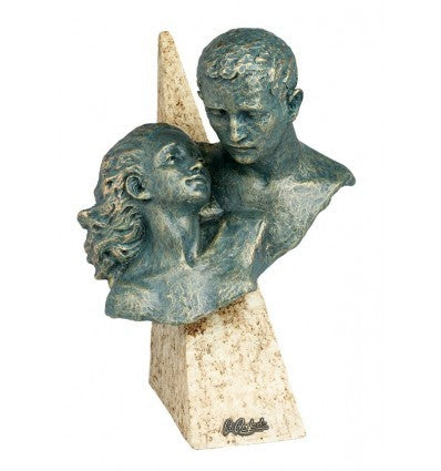 Esta escultura decorativa de tipo busto, representa a una pareja de jóvenes enamorados. La disposición de los dos bustos nos deja intuir que ella está reclinada sobre los brazos de él, mientras se contemplan mutuamente. Ambos parecen sentir una gran paz interna y felicidad por haber encontrado cobijo en los brazos del otro.