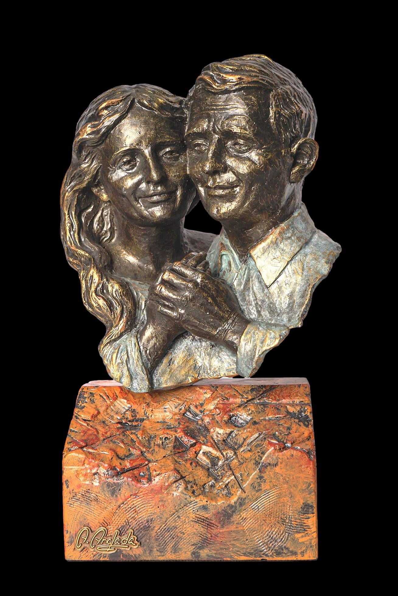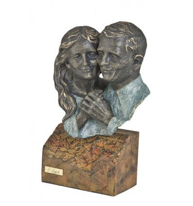 La pieza está fabricada en cuarzo y resina. Ángeles Anglada, la creadora de esta escultura de pareja, ha aplicado varias técnicas de acabado para conseguir diferentes efectos con bronce patinado, gracias a los cuales la obra brilla con múltiples tonos verde-azulados y dorados. Esta escultura podría ser un original adorno para tu casa, o un perfecto regalo de boda, por ejemplo, o para cualquier otra ocasión.