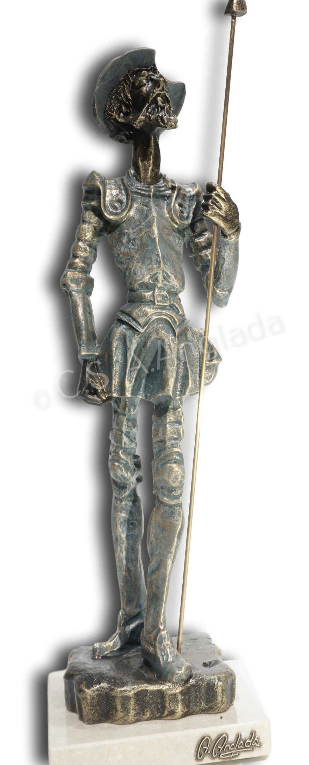 Se trata de una maravillosa representación de uno de los personajes más conocidos de la literatura española en todo el mundo, el hidalgo Don Quijote de La Mancha. Considerado y reconocido uno de los símbolos de España y todo un icono. Esta escultura decorativa muestra al personaje de pie, con su típica expresión de señor altanero, si bien todos sabemos de su noble corazón e intenciones. Es fascinante como Ángeles Anglada consigue trasmitirnos toda la sabiduría de este personaje en su rostro.