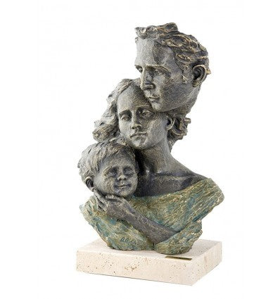 Escultura de maternidad que representa a una pequeña familia. La expresión de los personajes y la original disposición de los mismos, refleja el cariño y la unión que existe entre ellos. Parecen haberse fundido todos en un tierno abrazo.