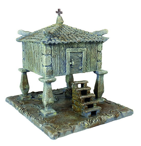 Preciosa escultura decorativa, que representa una construcción típica Asturiana, el hórreo asturiano. Empleado desde la antigüedad para almacenar grano y otros alimentos, manteniéndolos alejados de la humedad y de los pequeños animales.