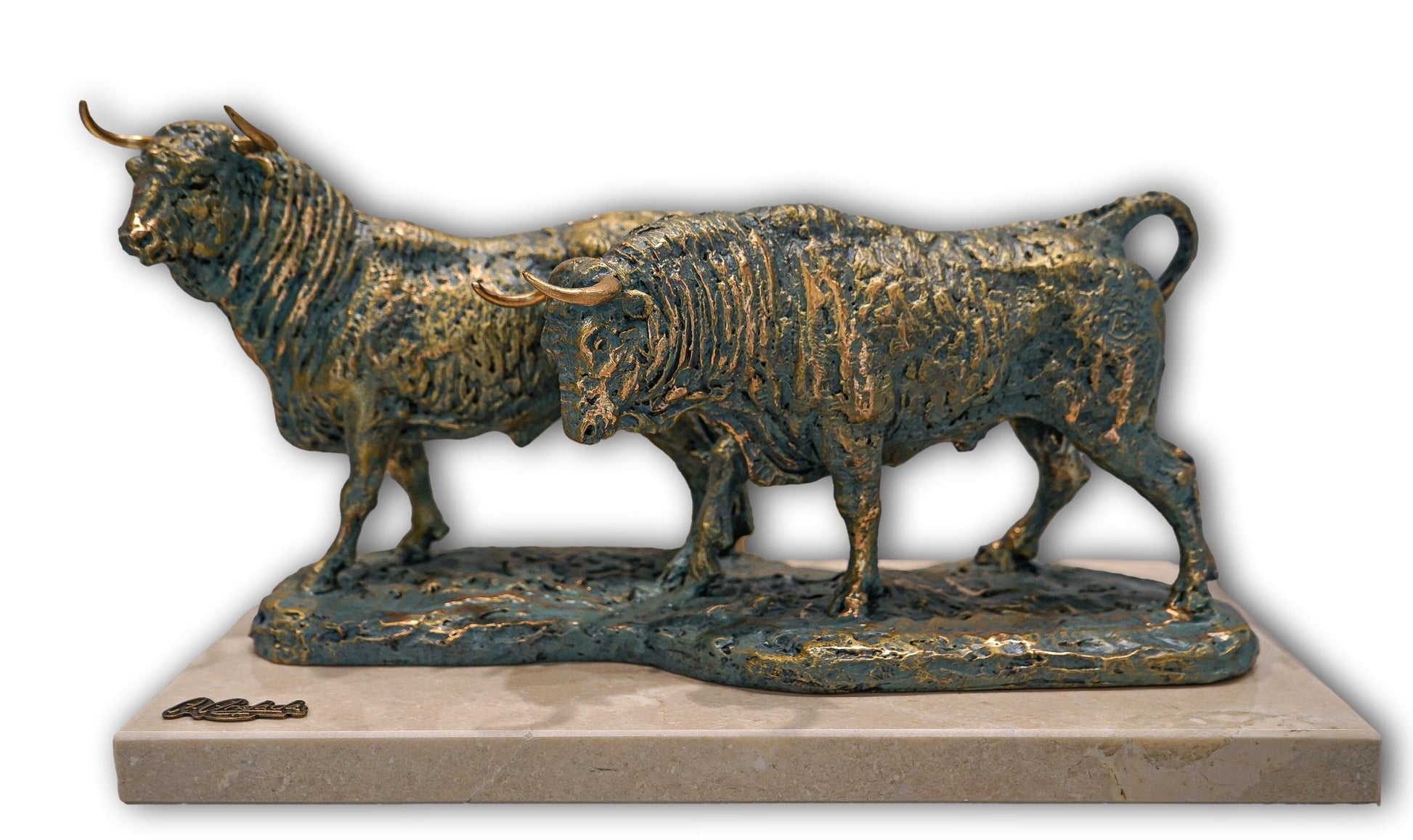 Manada de dos toros de bravos de lidia, elaborados en aglomerado de piedra caliza y resina, con acabado de bronce y patinas y sobre una base de mármol crema marfil.