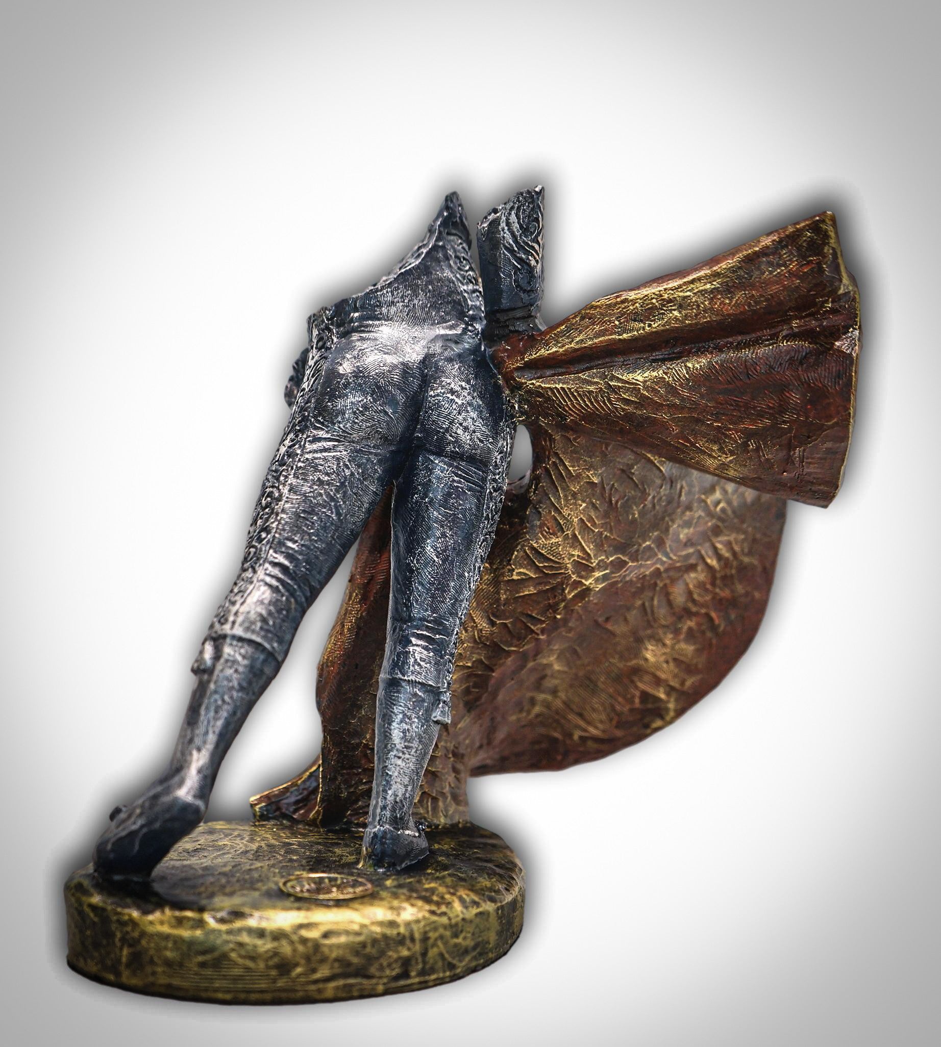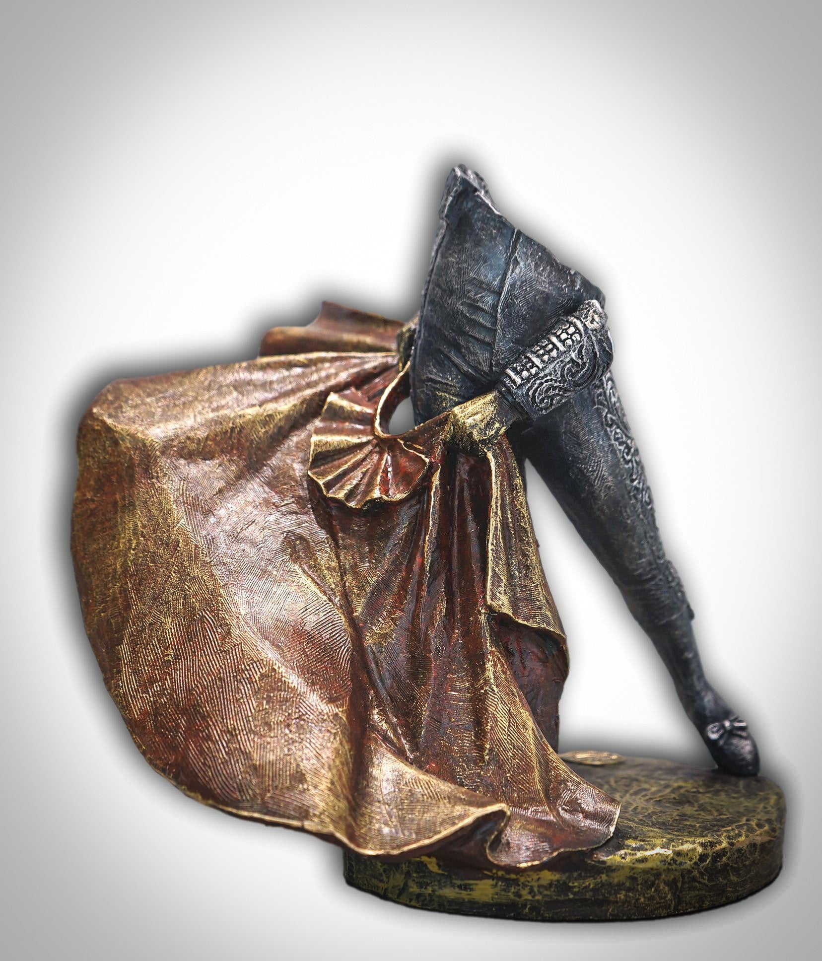 Preciosa escultura decorativa con acabado de bronce, que muestra a un torero en actitud de hacer media verónica.