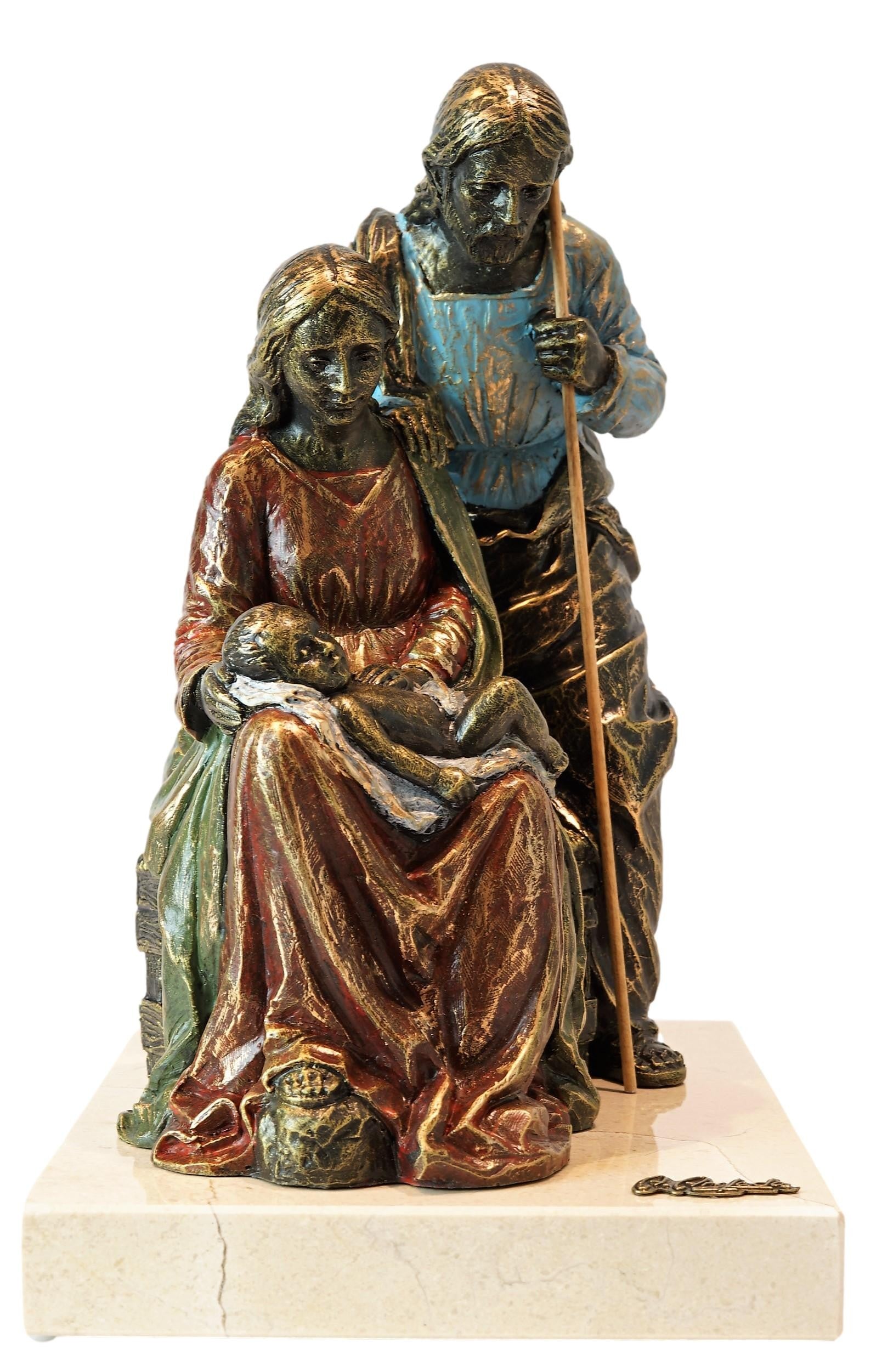 Escultura decorativa, de temática tradicional católica, que representa una escena religiosa con José, la virgen María y el niño Jesús. Los personajes aparecen sobre un lecho de rocas, con aptitud contemplativa. Los rostros de José y María expresan una gran devoción por su hijo.