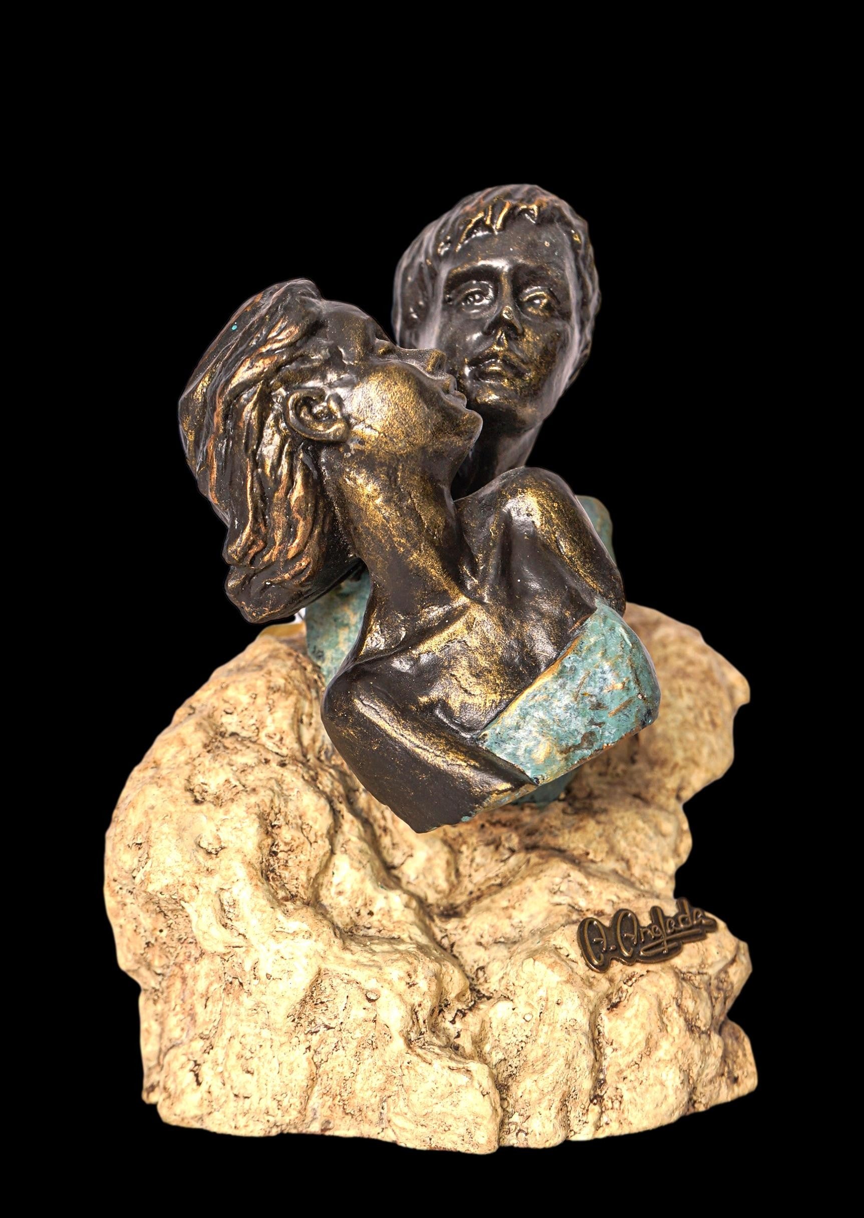 Esta escultura de amor podría ser el perfecto regalo para boda o de aniversario, no solo por su significado, sino también por su elegante ejecución. La escultura representa la parte más expresiva del cuerpo humano, su rostro. Los personajes parecen estar encantados el uno por el otro. El acabado en bronce, que utiliza la conocida escultora Ángeles Anglada, da un toque mágico a esta escultura de pareja.
