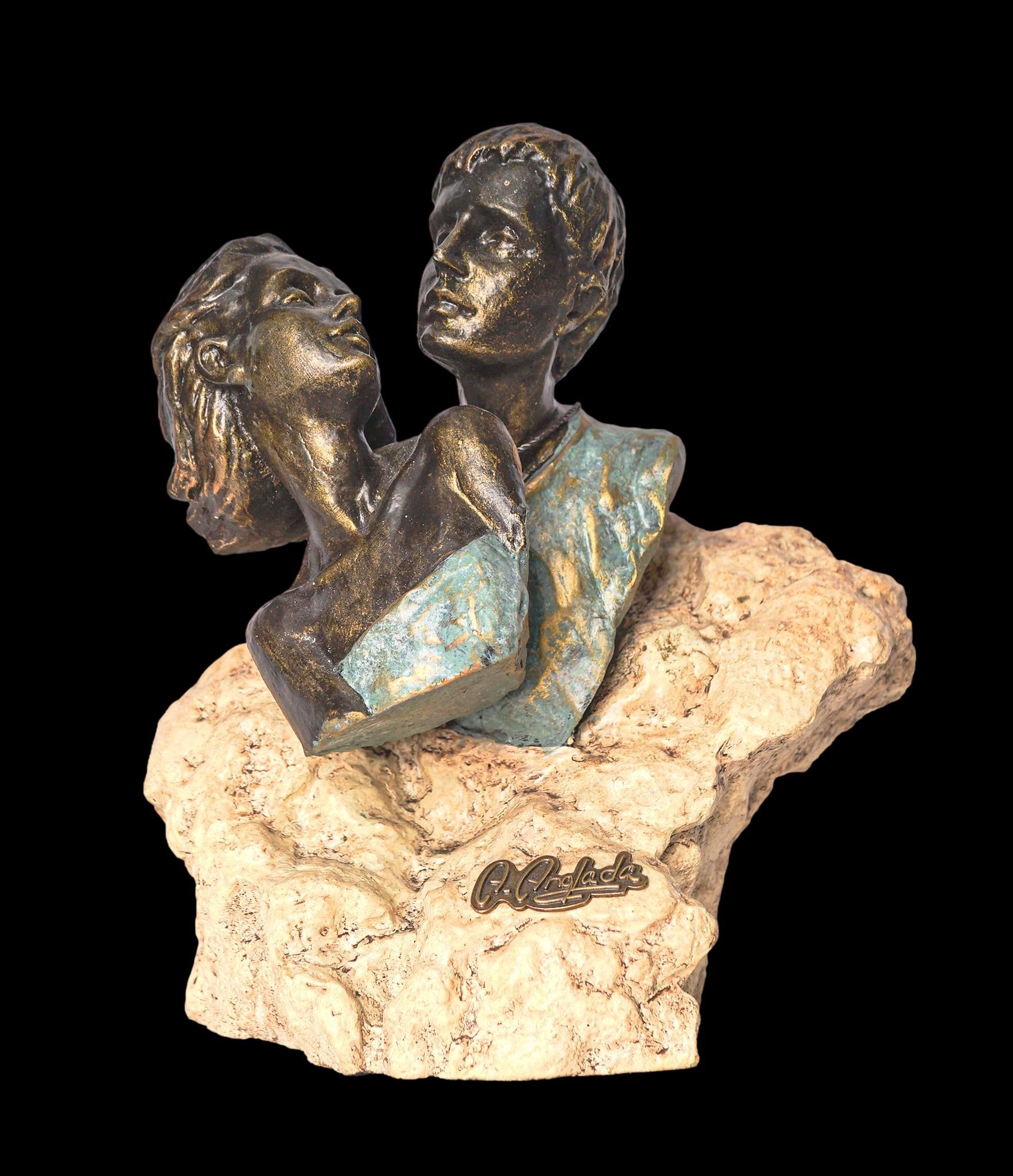 El nombre de esta preciosa obra de arte nos dice sin dejar lugar a duda alguna, de que trata esta pieza. Es una escultura de pareja, una pareja de enamorados, que por primera vez en su vida experimenta esta desbordante sensación de encontrar un mundo entero en los ojos de otra persona y poder perderse allí.