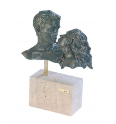 Es una escultura de tipo busto, que representa a una pareja de jóvenes. El chico contempla a su amada con admiración. La chica inclina la cabeza y parece acercarse para darle un beso. Los personajes de esta escultura se ven totalmente absortos el uno por el otro. Está obra de arte podría ser un magnifico regalo de boda, de aniversario, o tal vez un bonito detalle para tu pareja.