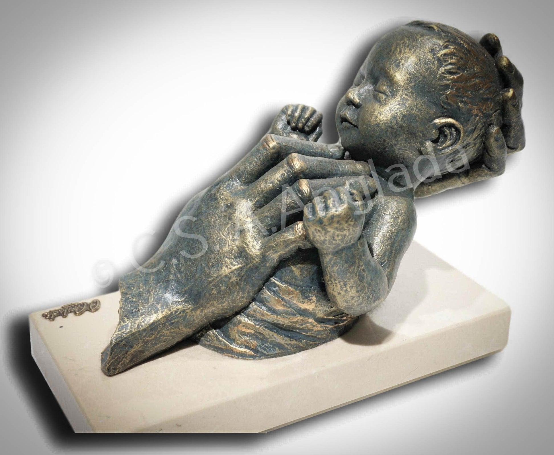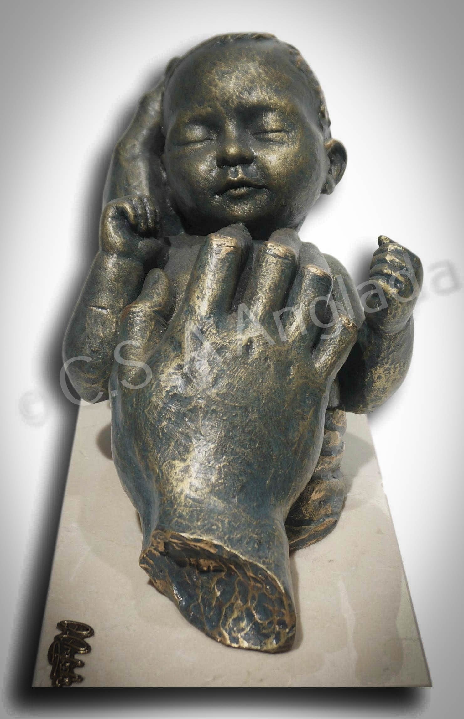 Escultura maternal, que representa a un bebé plácidamente dormido sobre las manos de su madre. Como bien es sabido por todos, no hay nada que relaje más a un bebé que el contacto directo con su madre. Estas manos, magistralmente diseñadas, simbolizan la protección que ofrece una madre a su hijo.