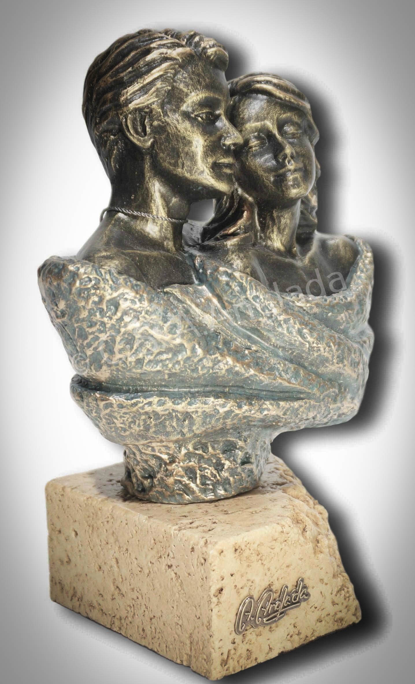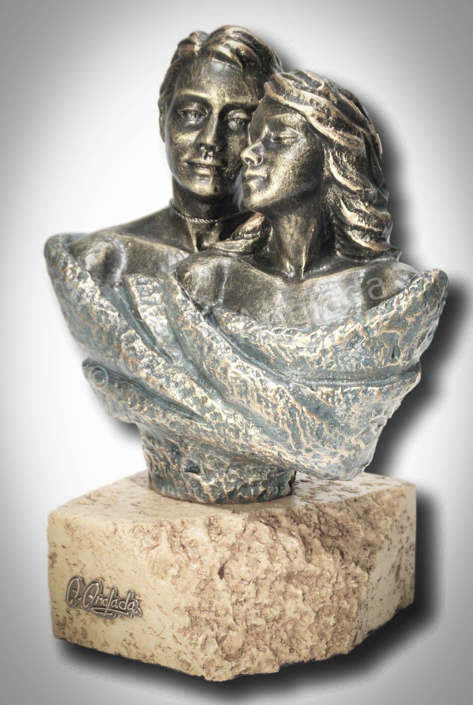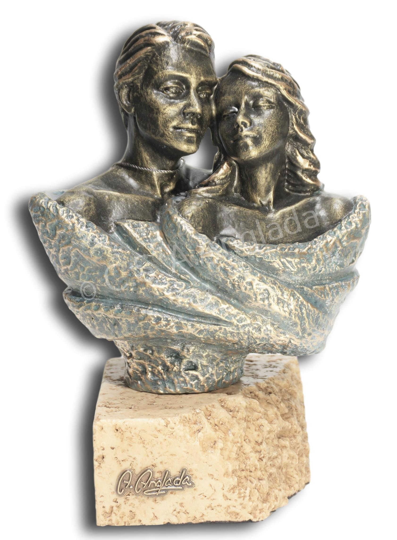 La escultura de pareja “Tú y yo” es un busto que representa a una pareja de jóvenes enamorados envueltos en una sábana. La chica tiene los ojos casi cerrados, del placer de estar en los brazos de su media naranja. Ambos personajes tienen una ligera sonrisa en sus caras y parecen estar disfrutando de sumutua compañía. A pesar de su pequeño tamaño, esta escultura de amor nos trasmite perfectamente los sentimientos de la pareja.