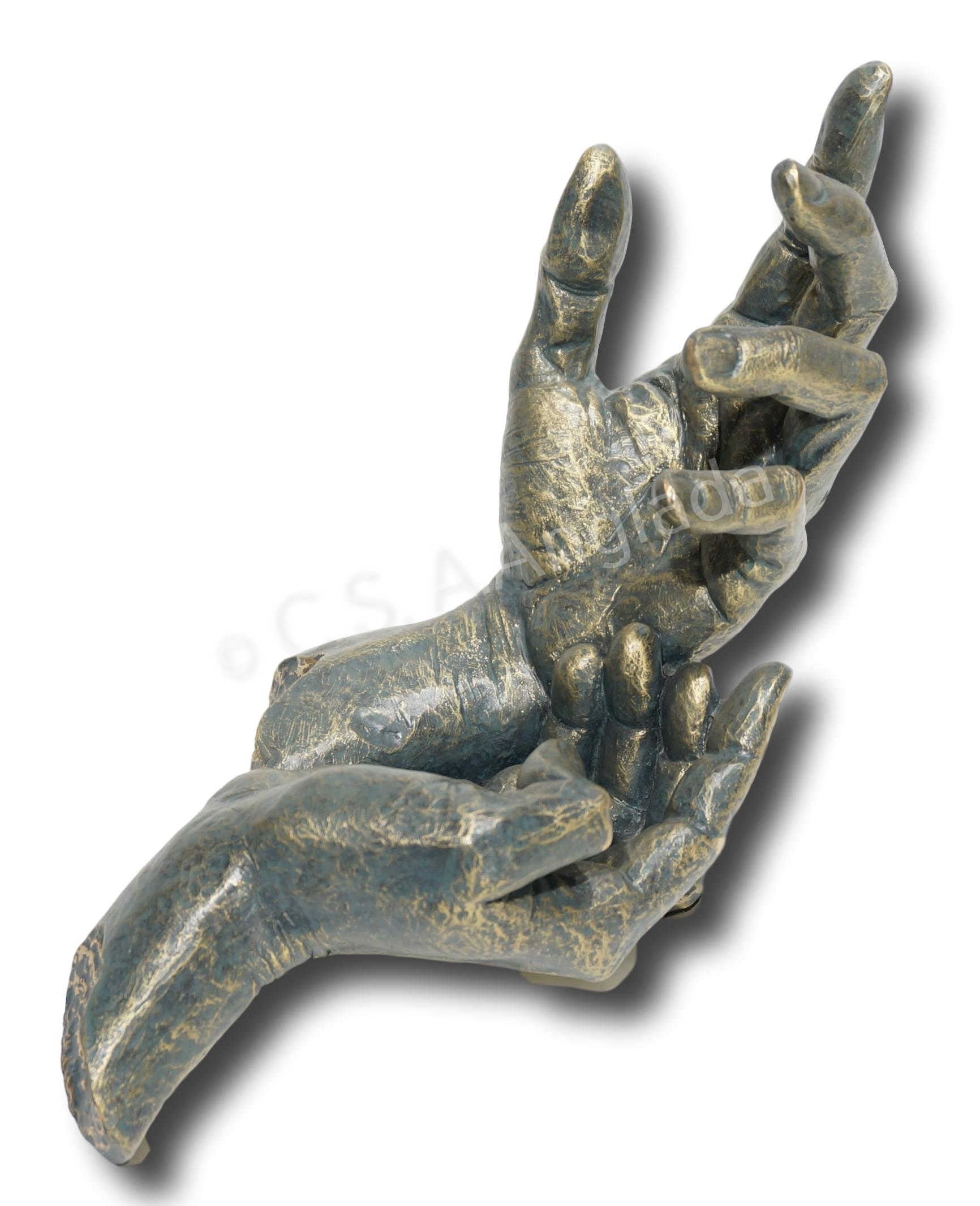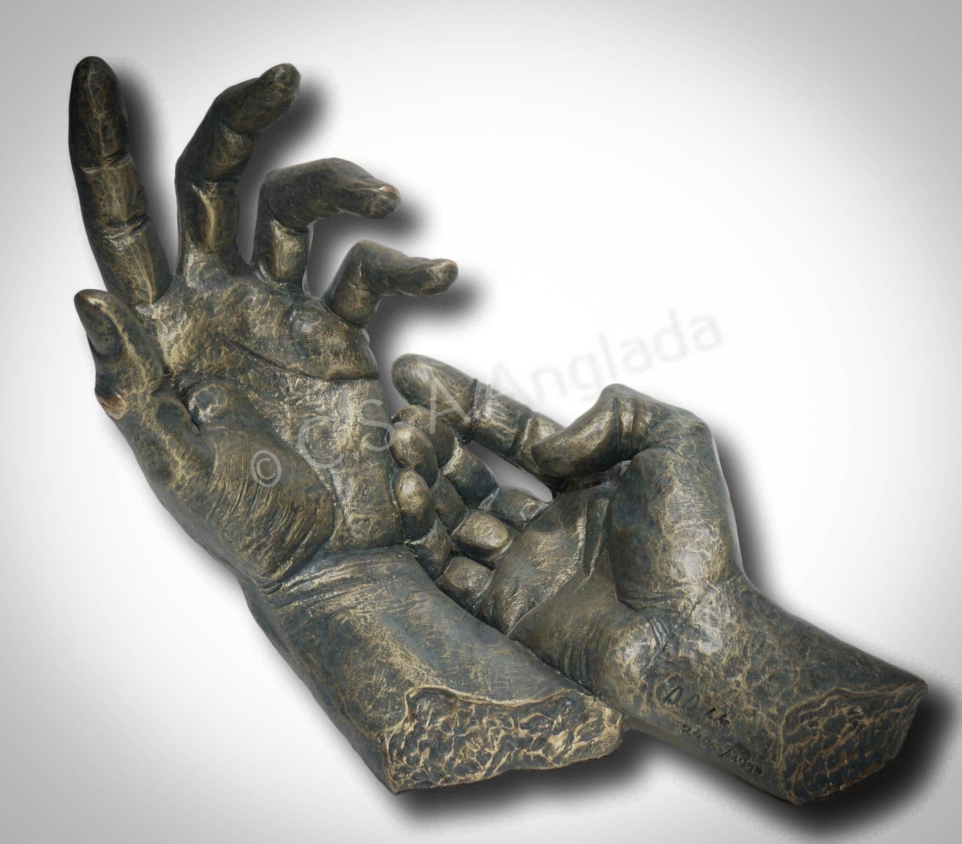 Esta escultura de manos ha sido fabricada en cuarzo y resina, con acabado en bronce patinado. Las dimensiones de la pieza son de 16 x 28 x 19 cm.