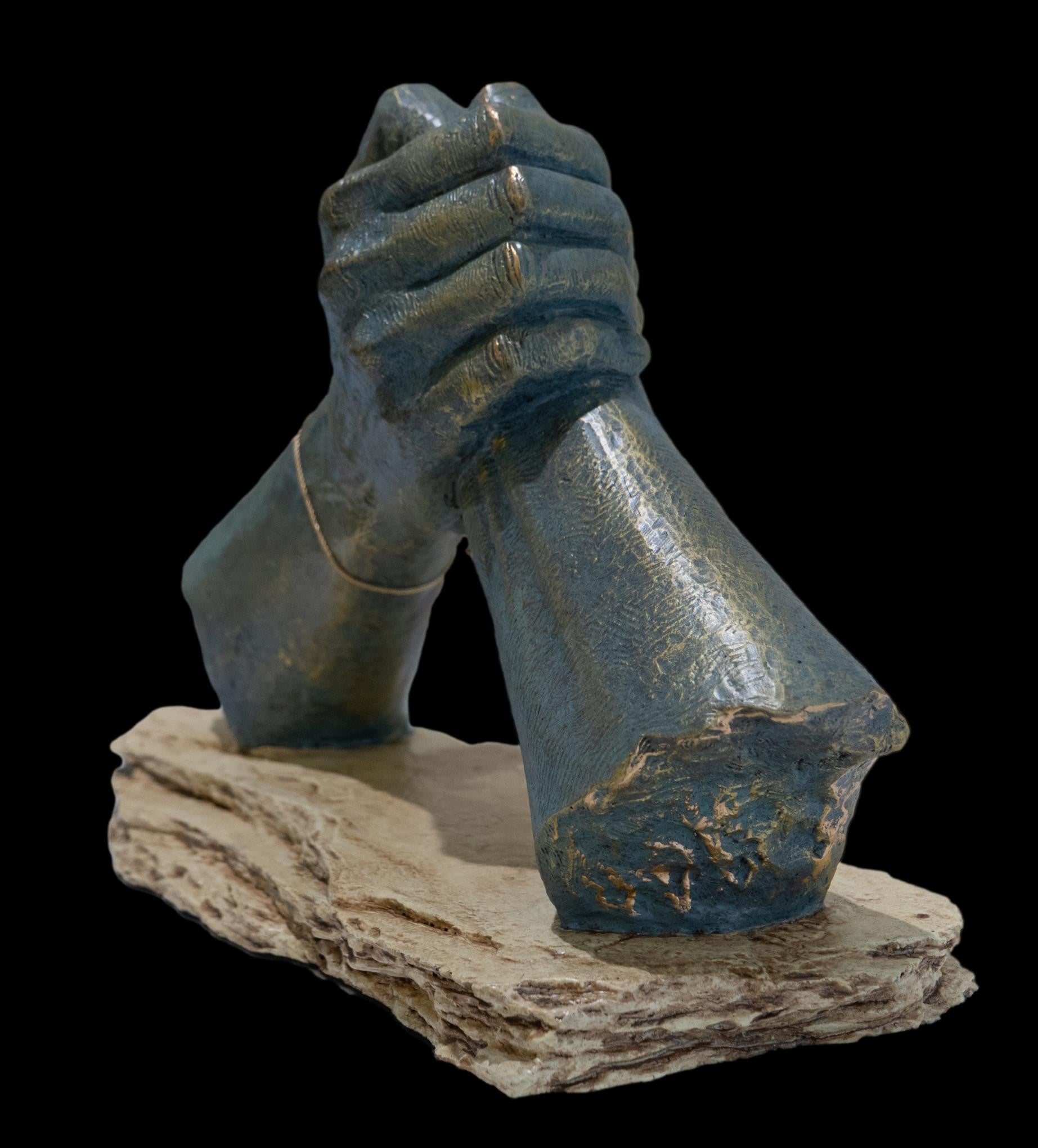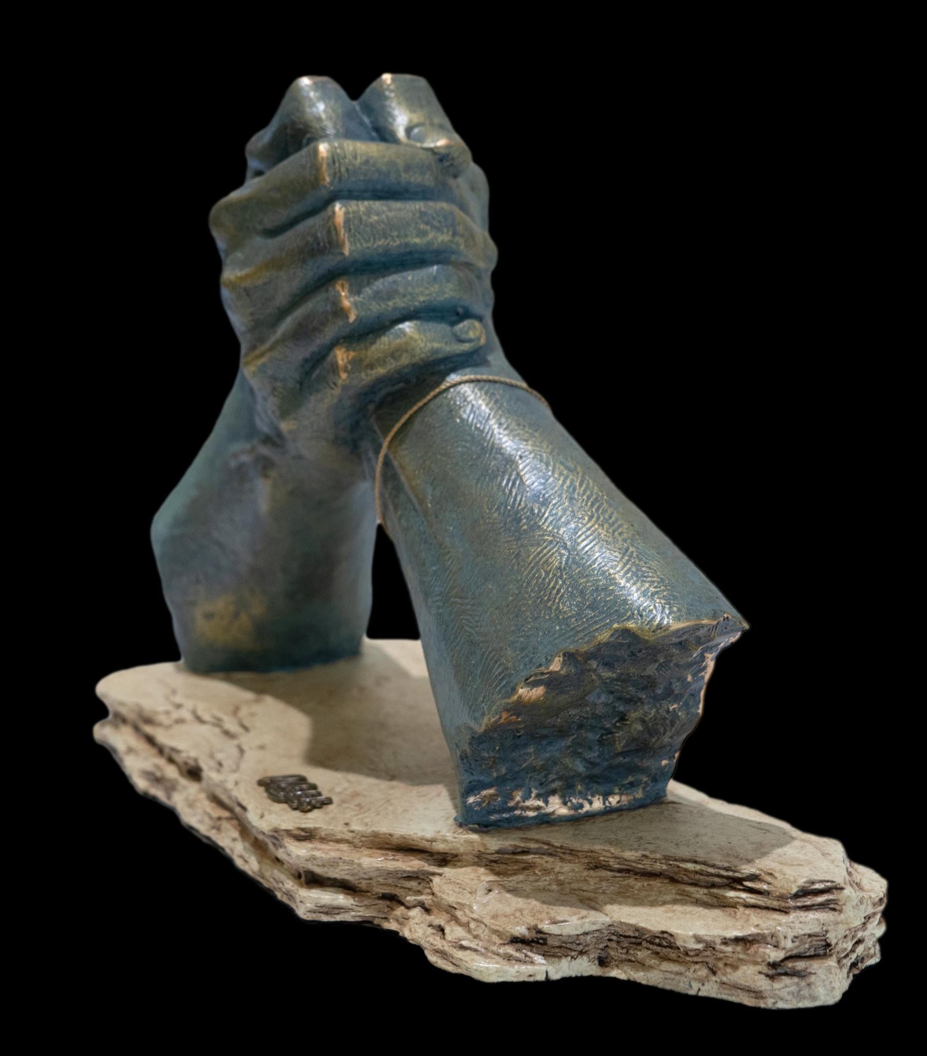Materiales utilizados: aglomerado de piedra caliza y resina, acabado bronce verde y patinas.
