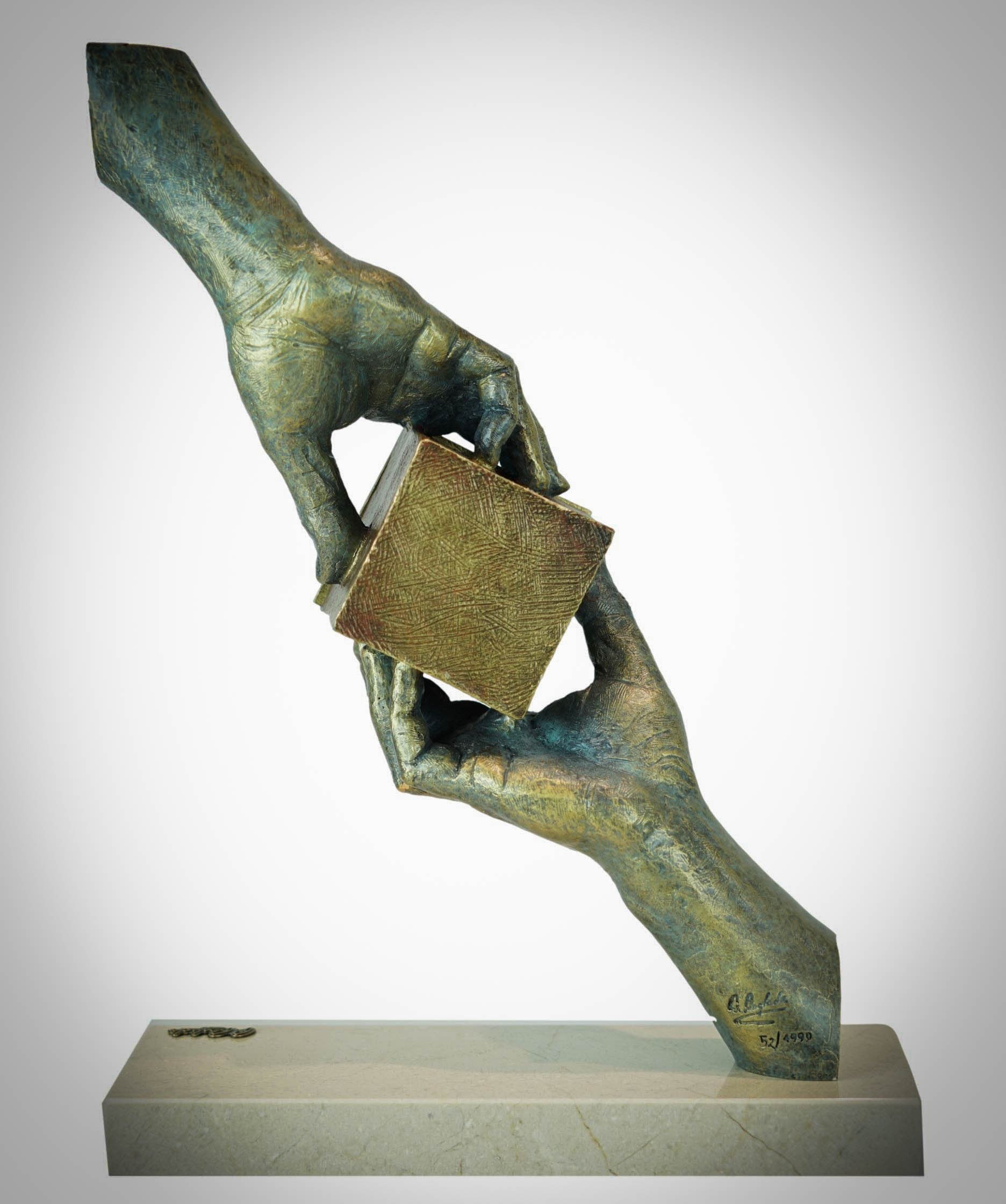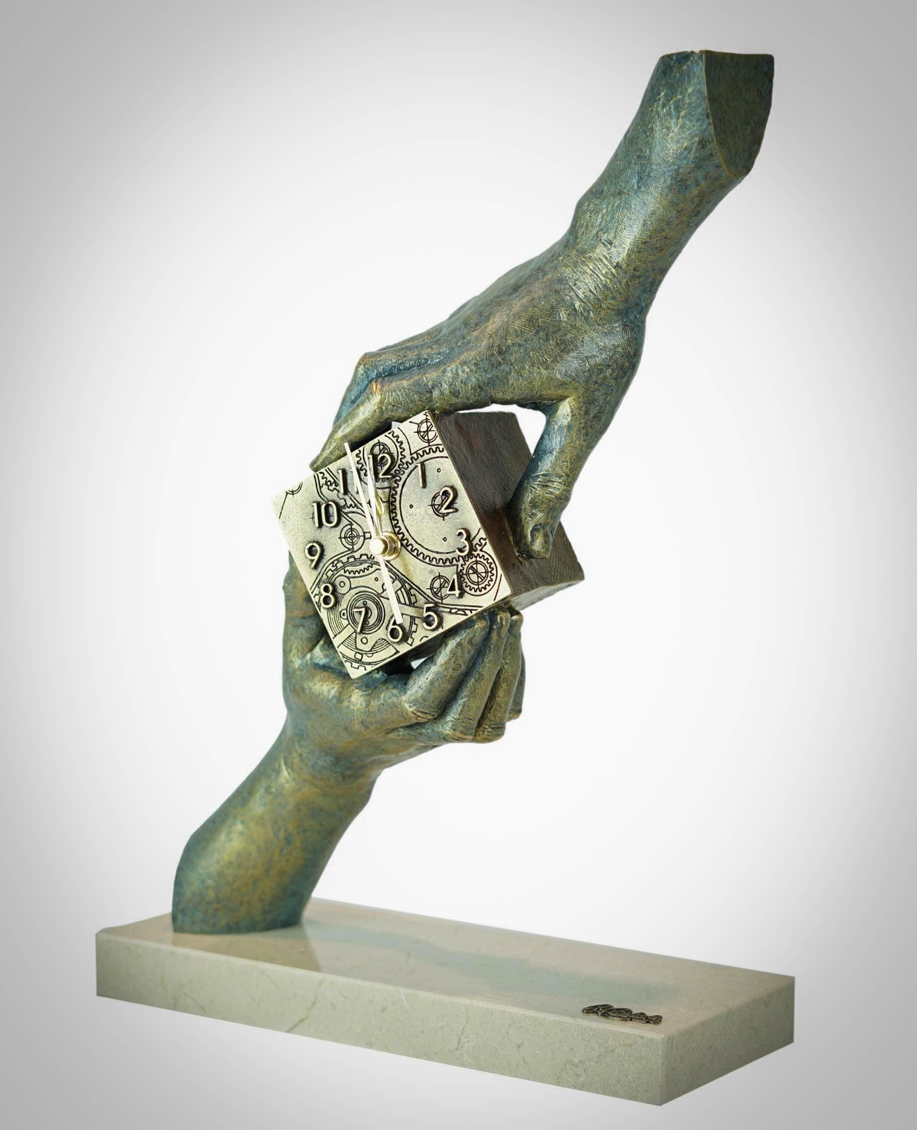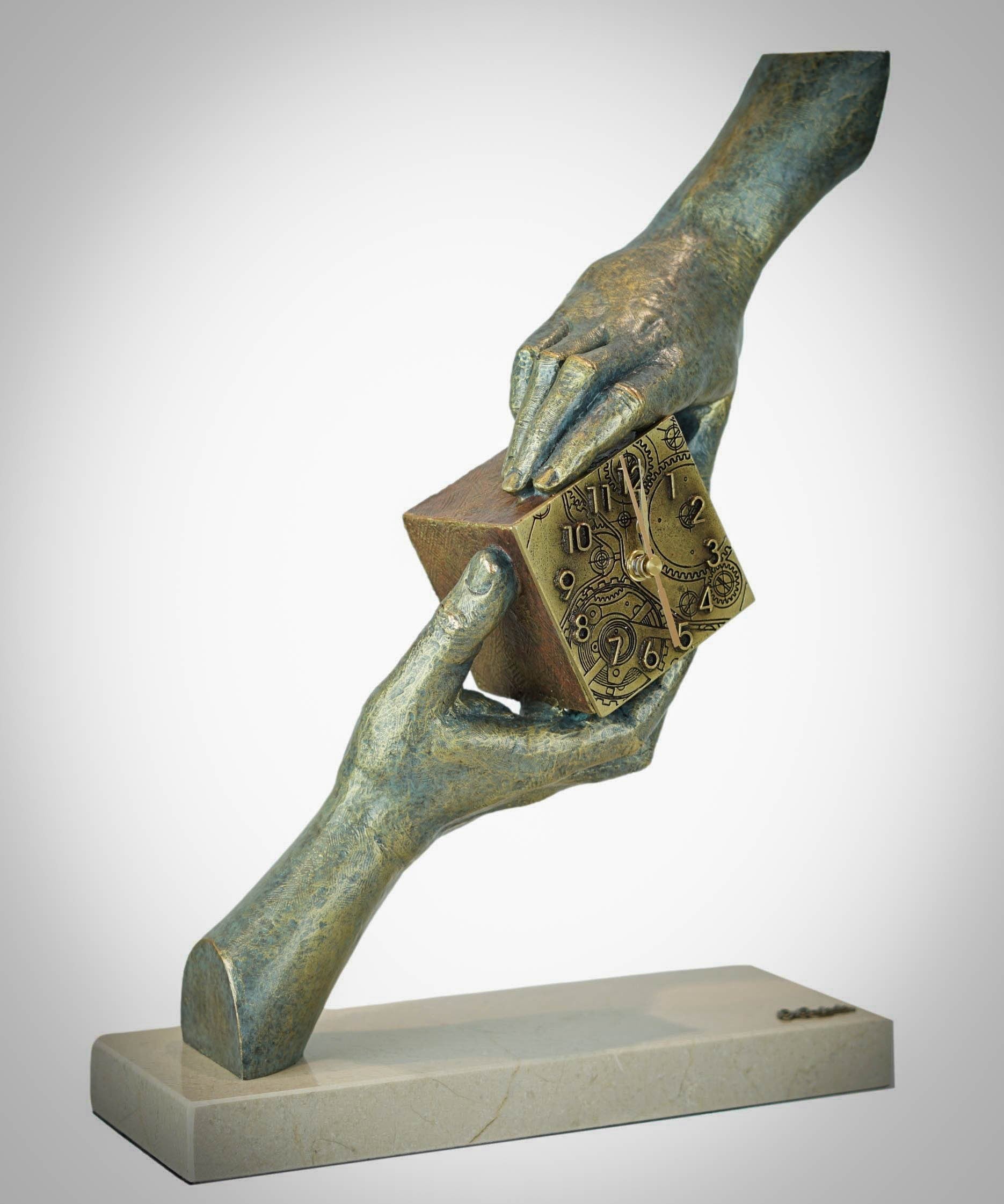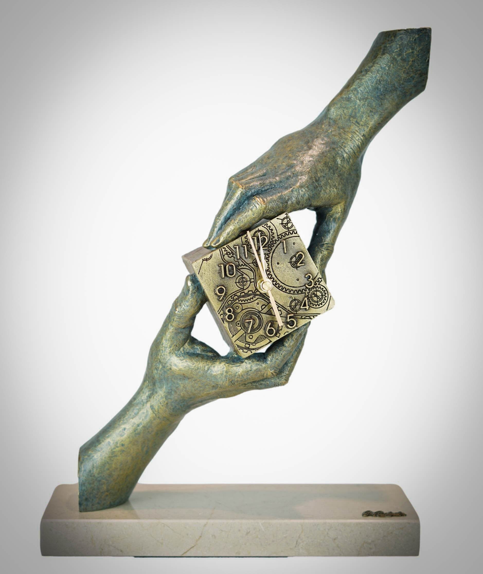 Escultura reloj de serie limitada. Se compone de dos manos en diagonal sujetando un reloj cuadrado,
