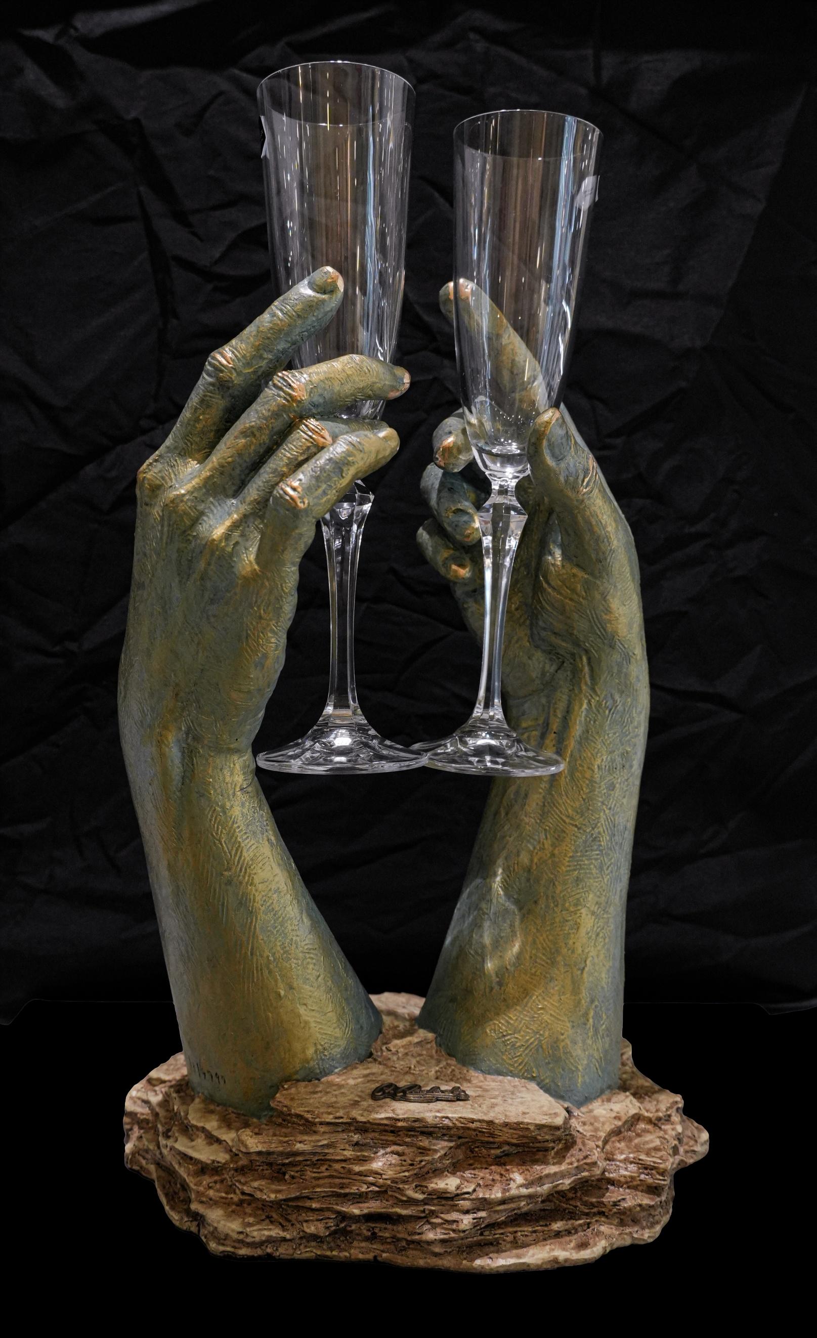 Manos que transmiten celebración. Nuevamente Ángeles Anglada nos sorprende con otra escultura de manos. Copas incluidas