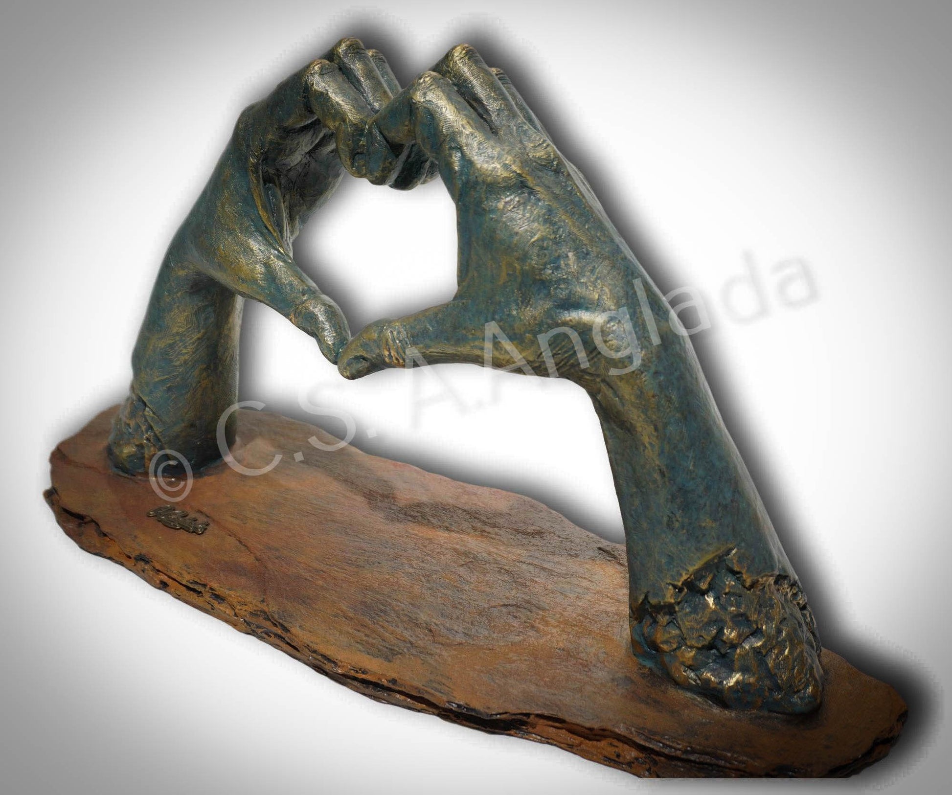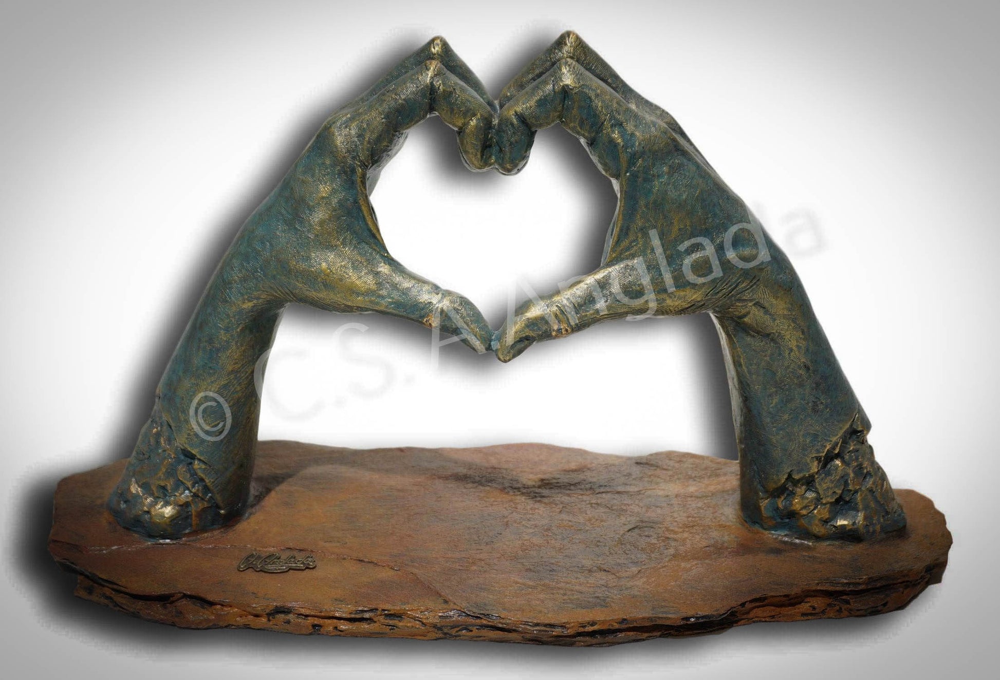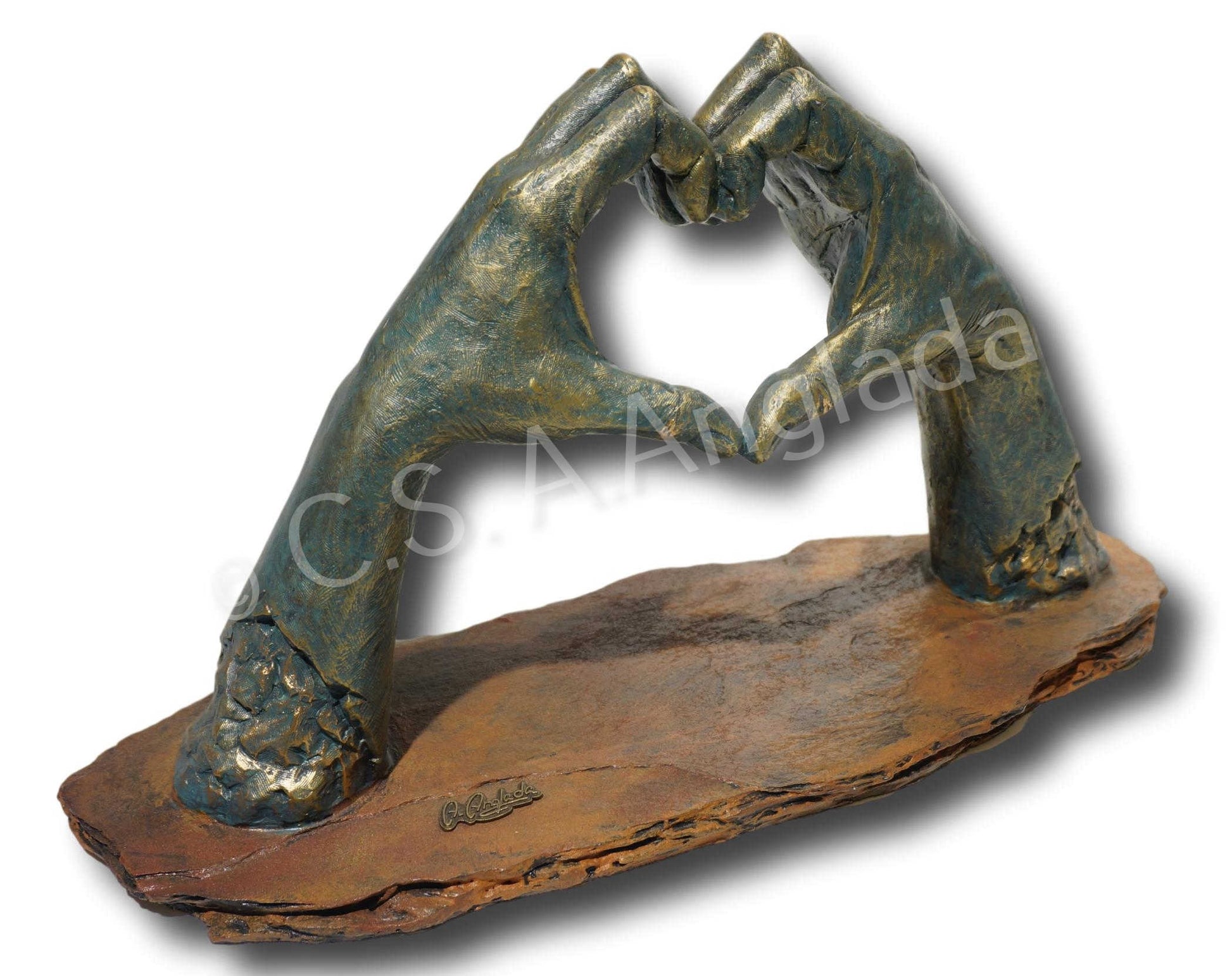 Está compuesta de cuarzo y resina, con acabado de bronce patinado. Esta pieza de arte es muy compacta. Sus reducidas dimensiones permiten colocarla prácticamente sobre cualquier superficie. Ya sea tu mesa de trabajo, el mueble del salón o la mesita de noche, siempre podrás disfrutar de esta maravillosa escultura de manos en forma de corazón.