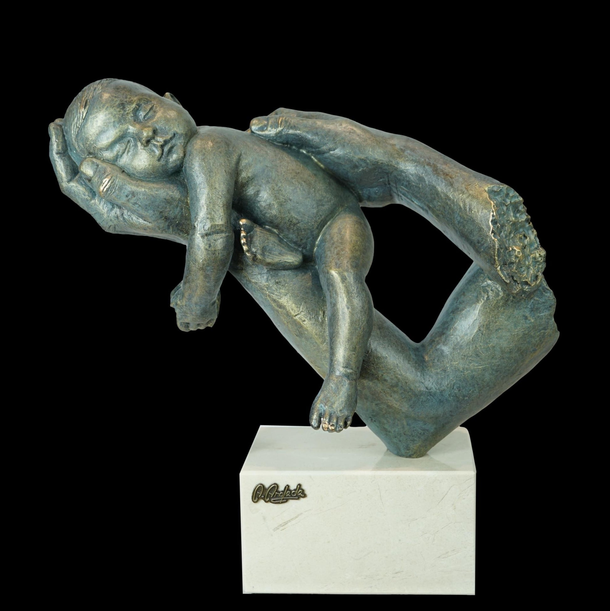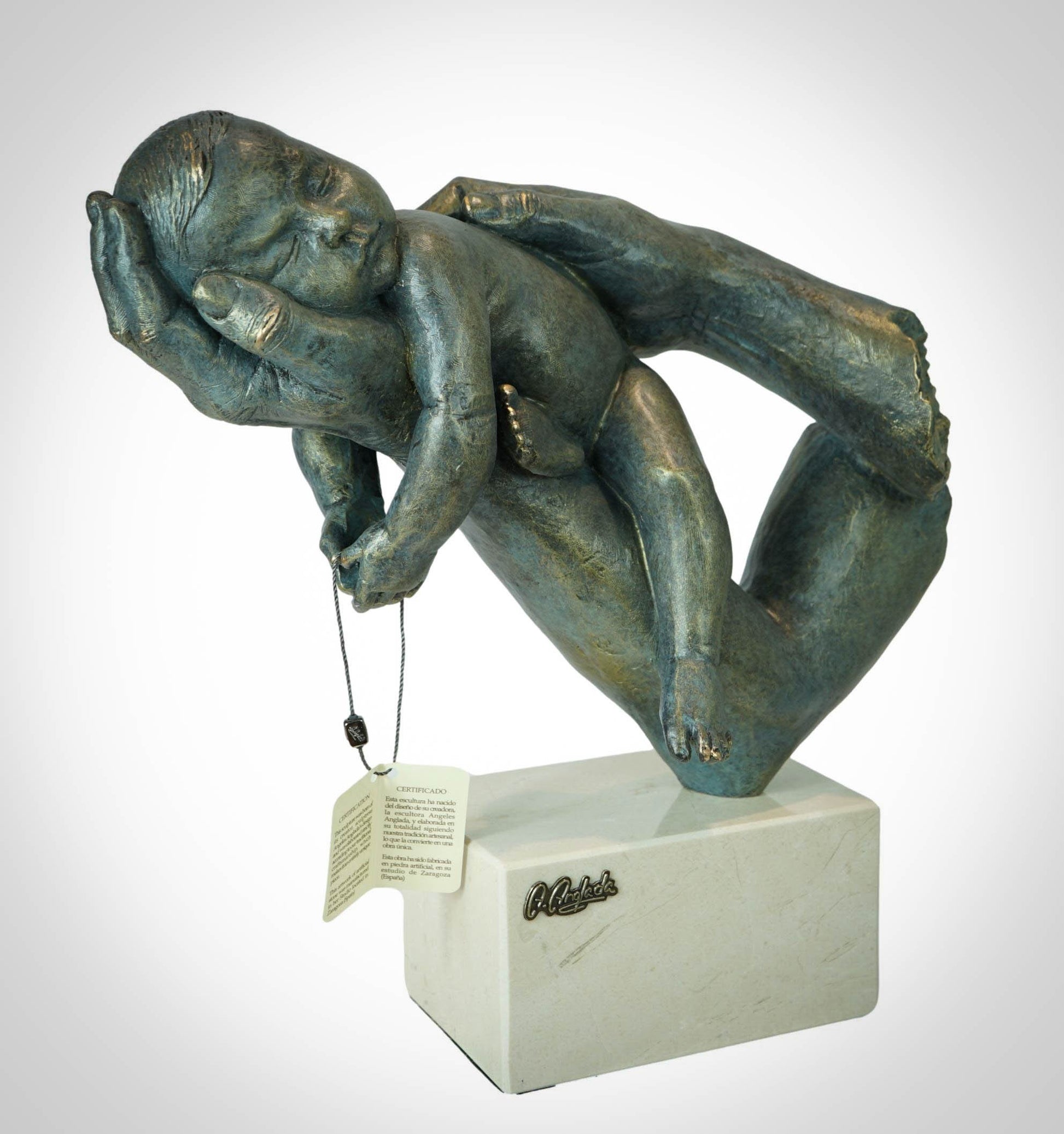 Escultura realista inspirada en la maternidad, que muestra a un bebé plácidamente dormido sobre las manos de su madre. Representa una de las escenas familiares más bonitas de la vida, un bebé dormido sobre su madre, mientras esta lo protege y lo acaricia. La gran cantidad de detalles que podemos observar en esta obra, así como la disposición de sus elementos, hacen que alcance un alto grado de realismo. Consigue transmitir una sensación de paz y sosiego muy agradables, que a la vez nos hace sonreír.