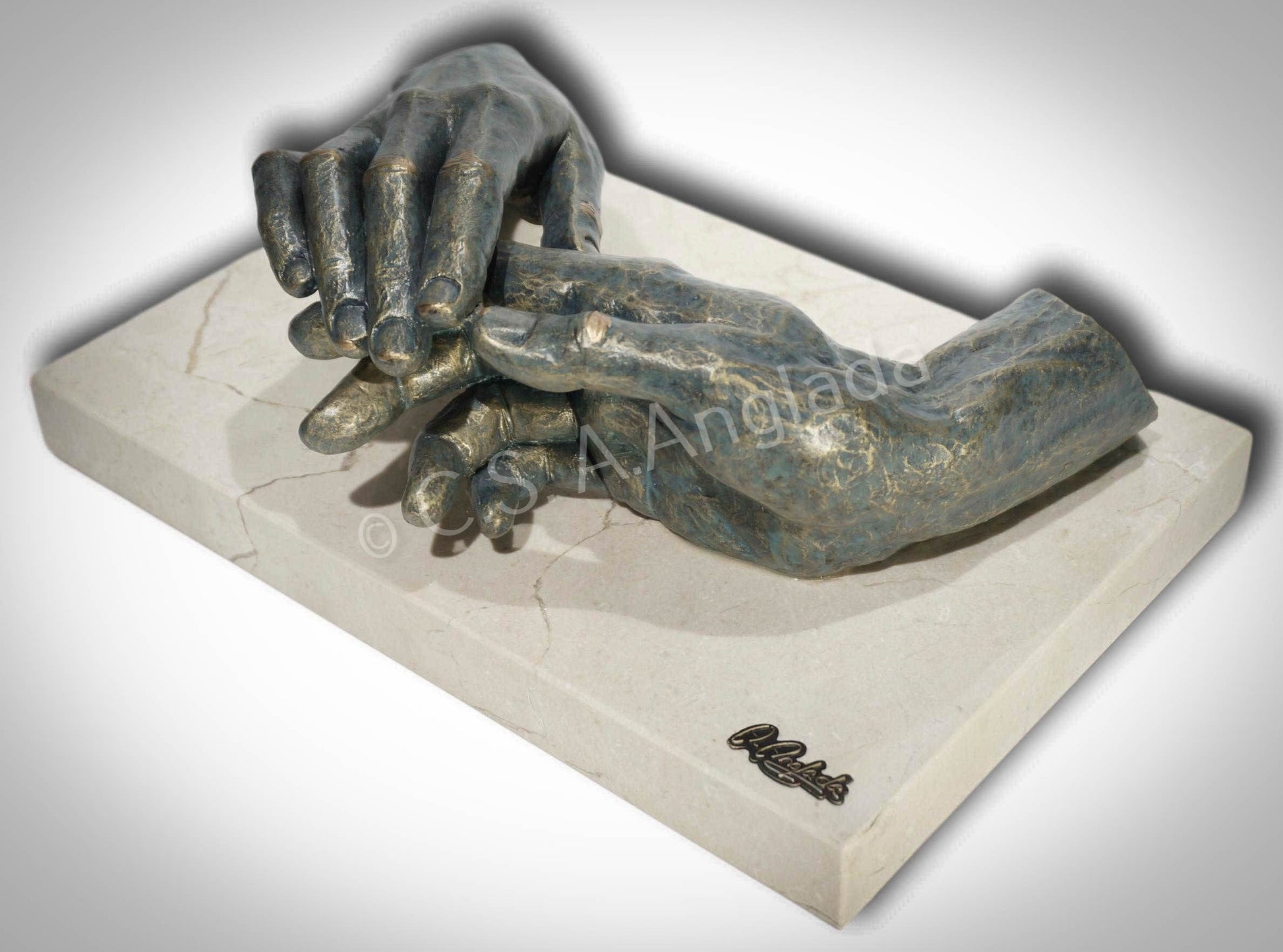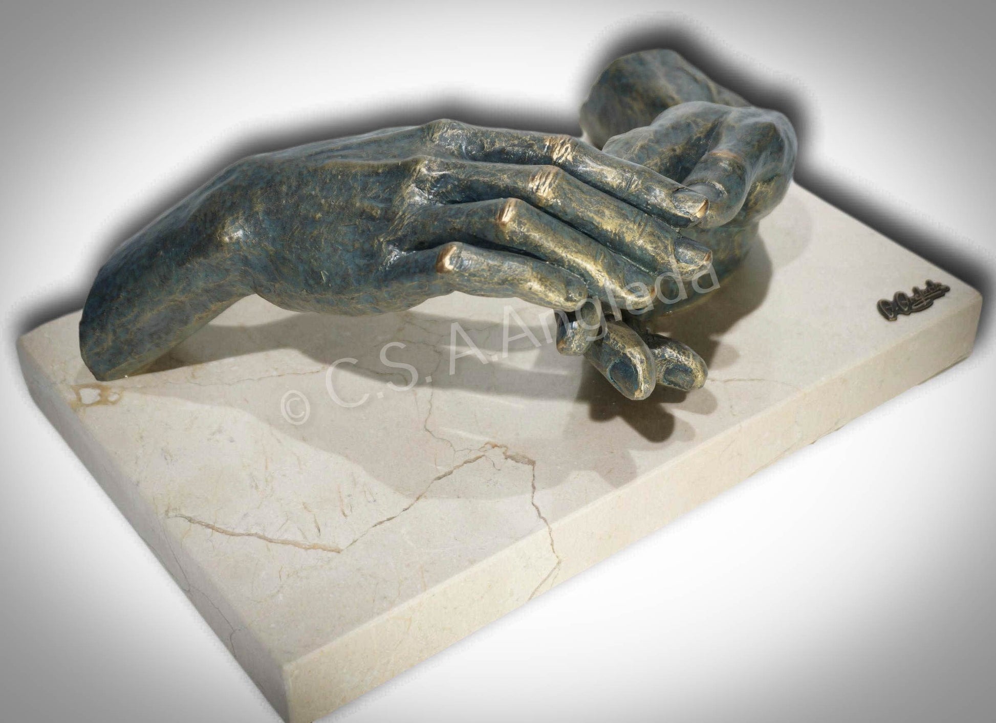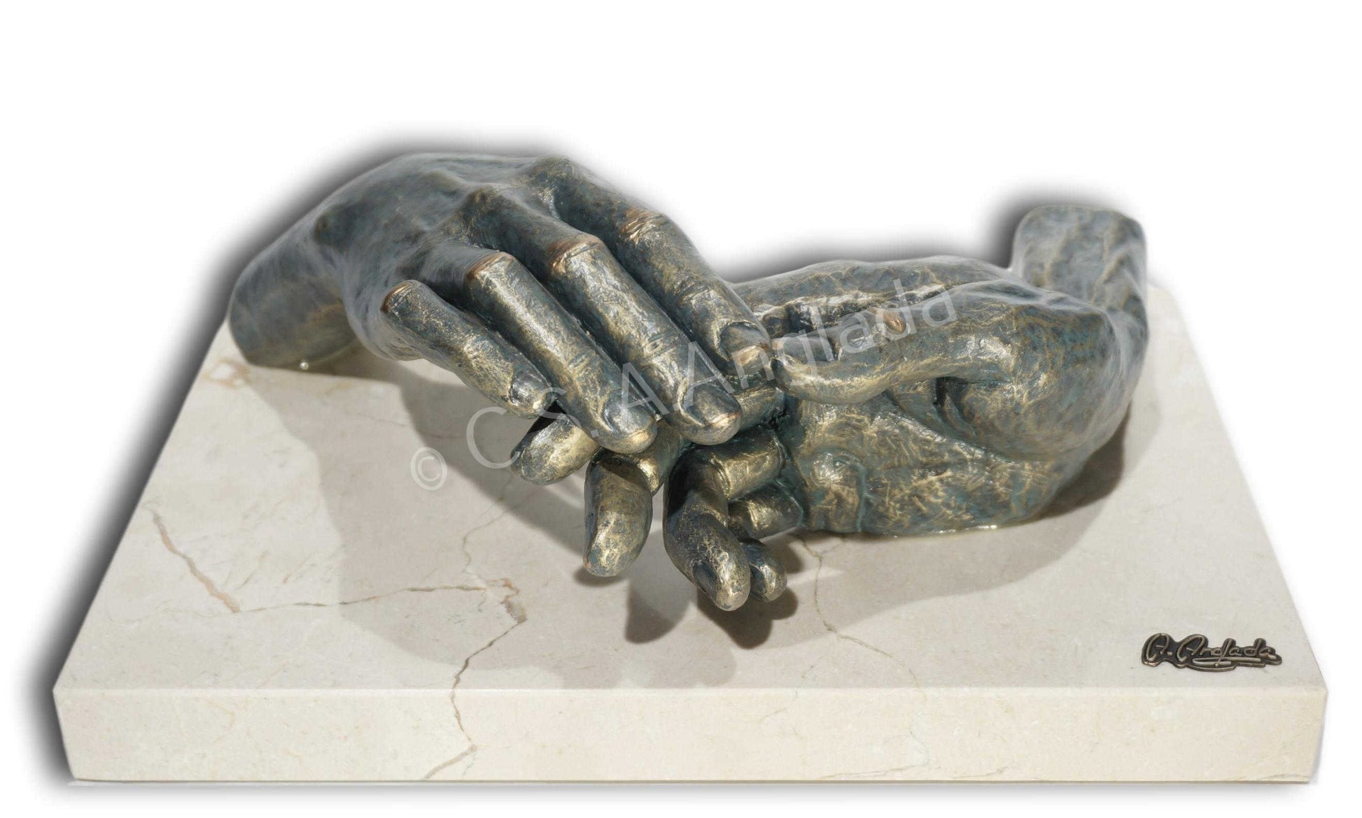 Esta decorativa escultura de manos está fabricada en cuarzo y resina, con acabado en bronce patinado. Las dimensiones son de 32 x 19 x 12 cm.
