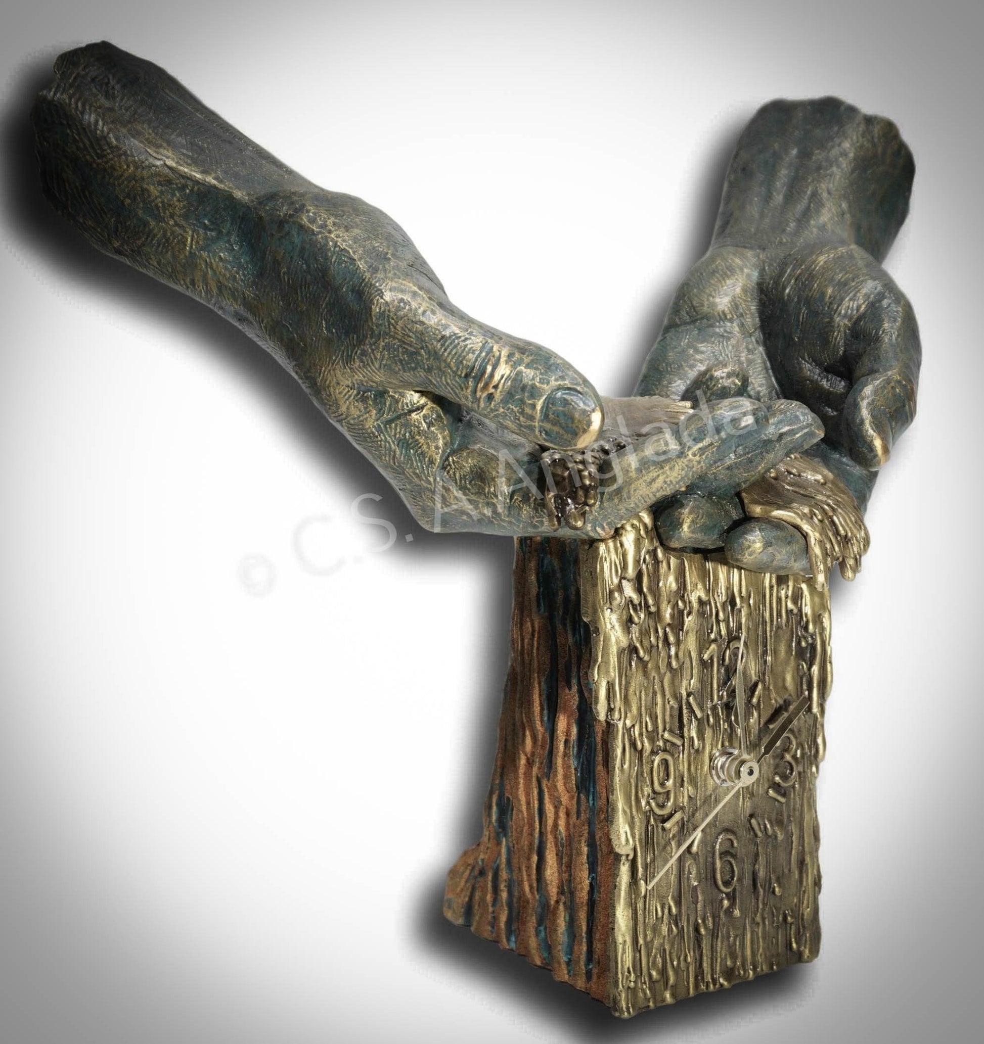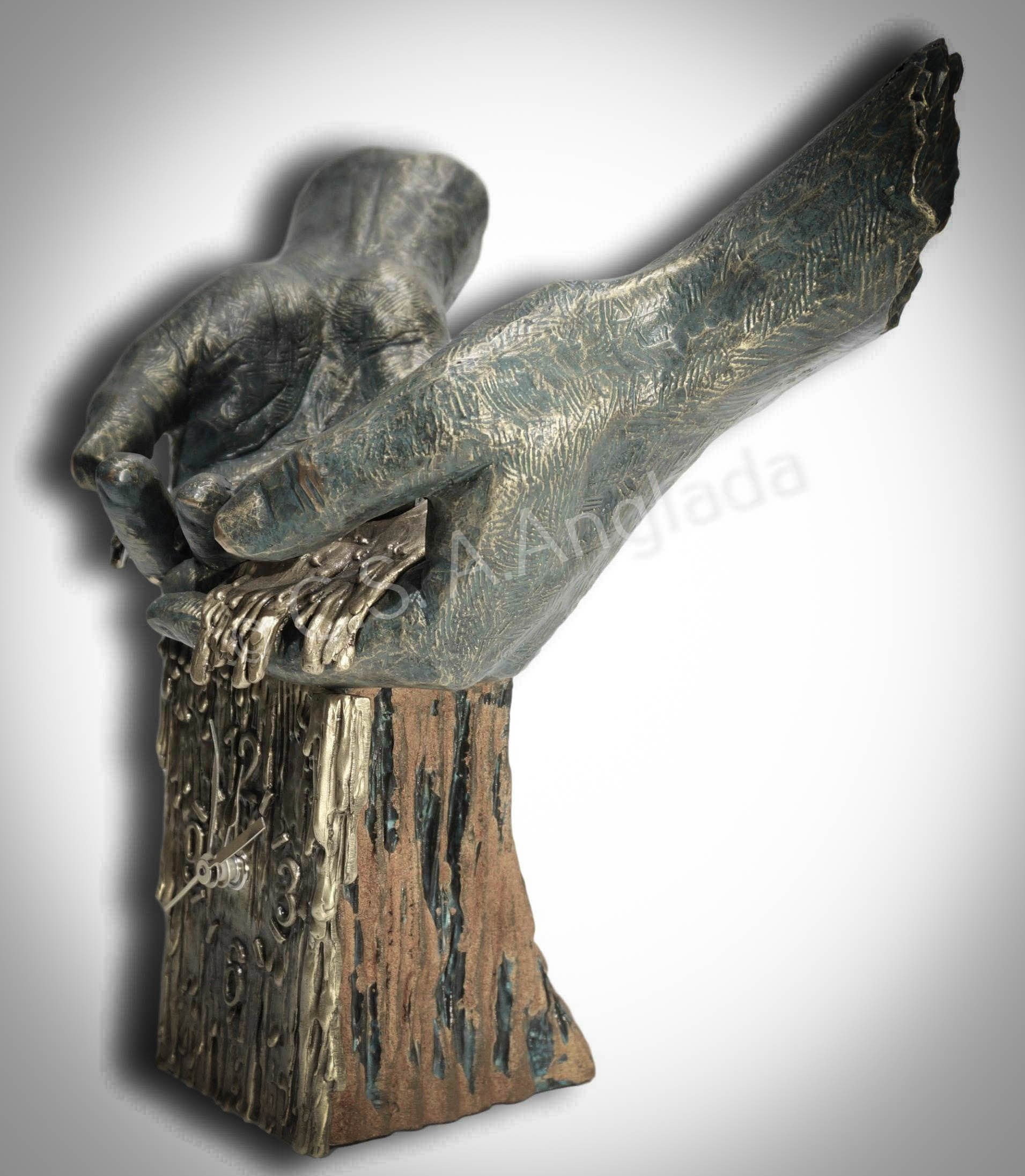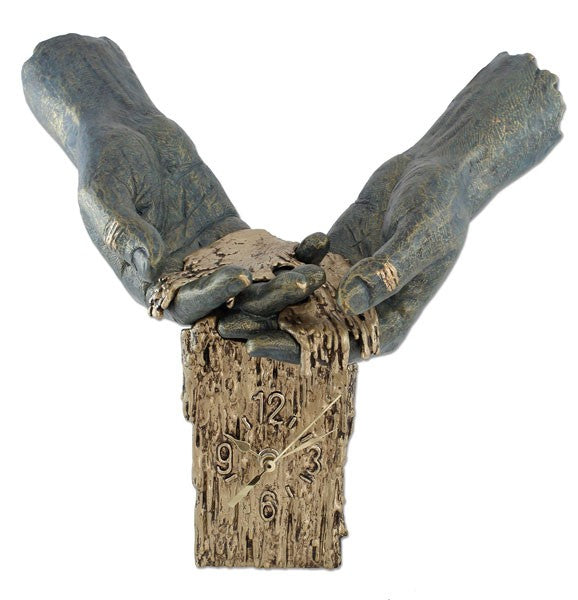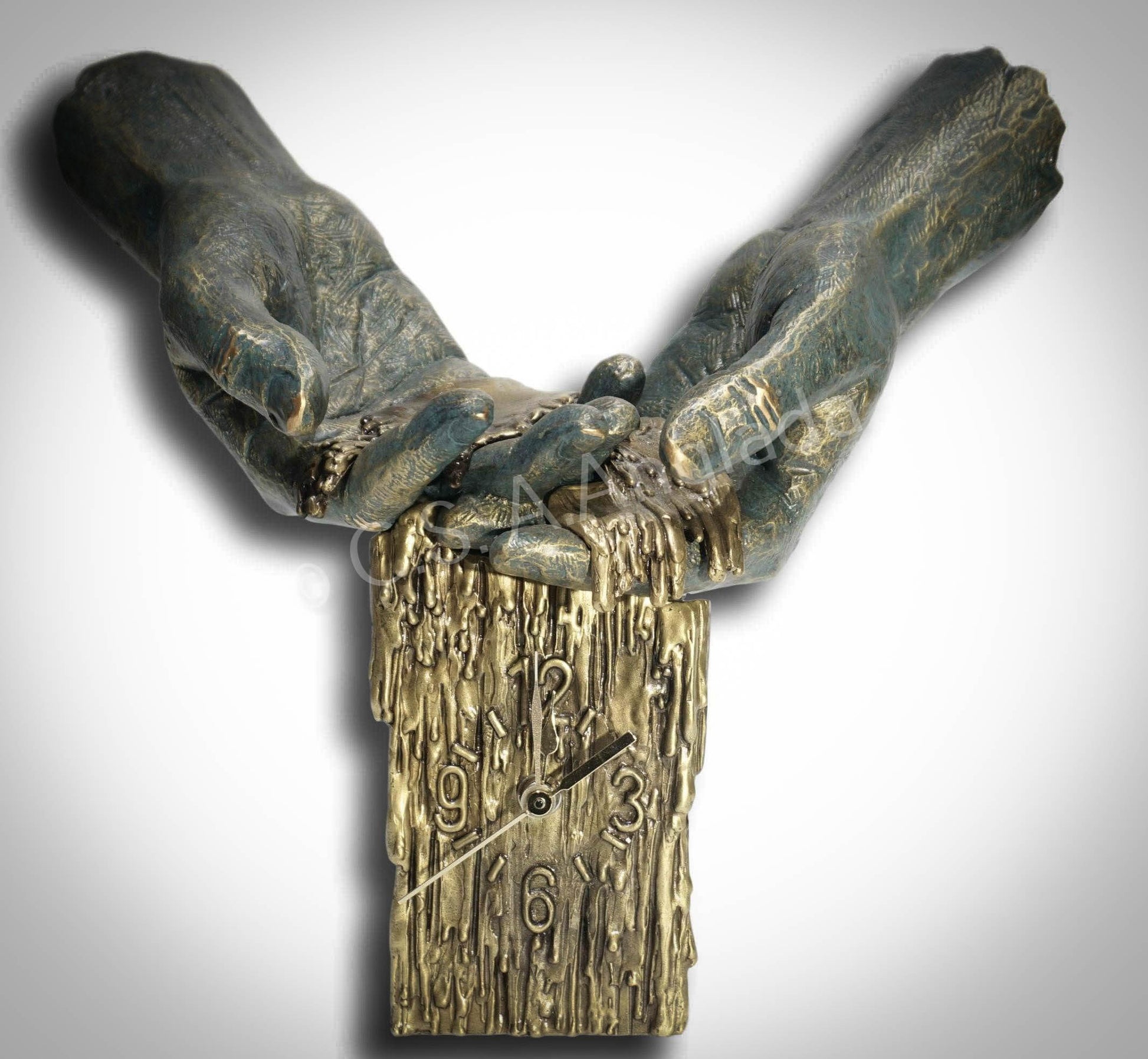 Es una escultura decorativa que aportaría a cualquier espacio no solo un gran valor estético, sino también un sofisticado toque filosófico para hacer reflexionar a cualquiera que la contemple. La escultura nos muestra unas manos sujetando un reloj que se está fundiendo entre los dedos. El mensaje de la esta decorativa escultura es muy claro, el tiempo pasa muy rápido y se escapa a nuestro control, como el agua entre los dedos. Debemos aprender a gestionarlo y a decidir en que merece la pena invertirlo. Pero lo más importante, y es algo que se nos olvida constantemente, es que cada instante es maravilloso por su singularidad y hay que saber disfrutar cada segundo que vivimos en este precioso planeta.