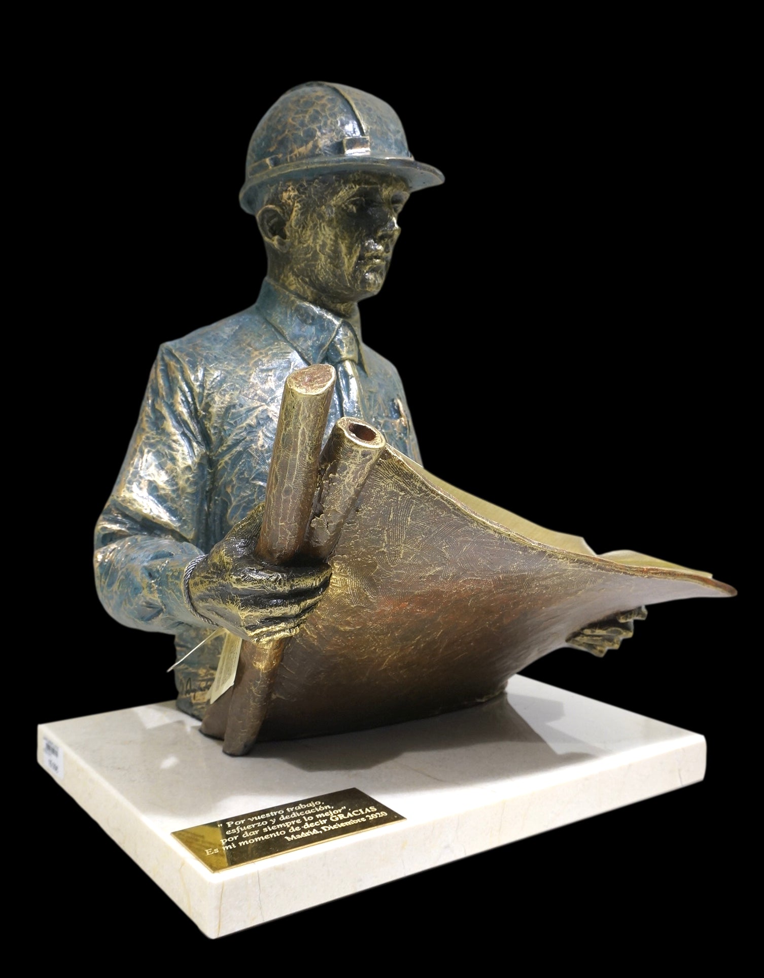 Esta escultura dedicada a los ingenieros, arquitectos y aparejadores descansa sobre una peana de mármol, lo que nos permite añadir una elegante placa metálica con una dedicatoria grabada en ella. Este servicio te lo ofrecemos de forma gratuita. Haz que tu regalo tenga un valor incalculable.