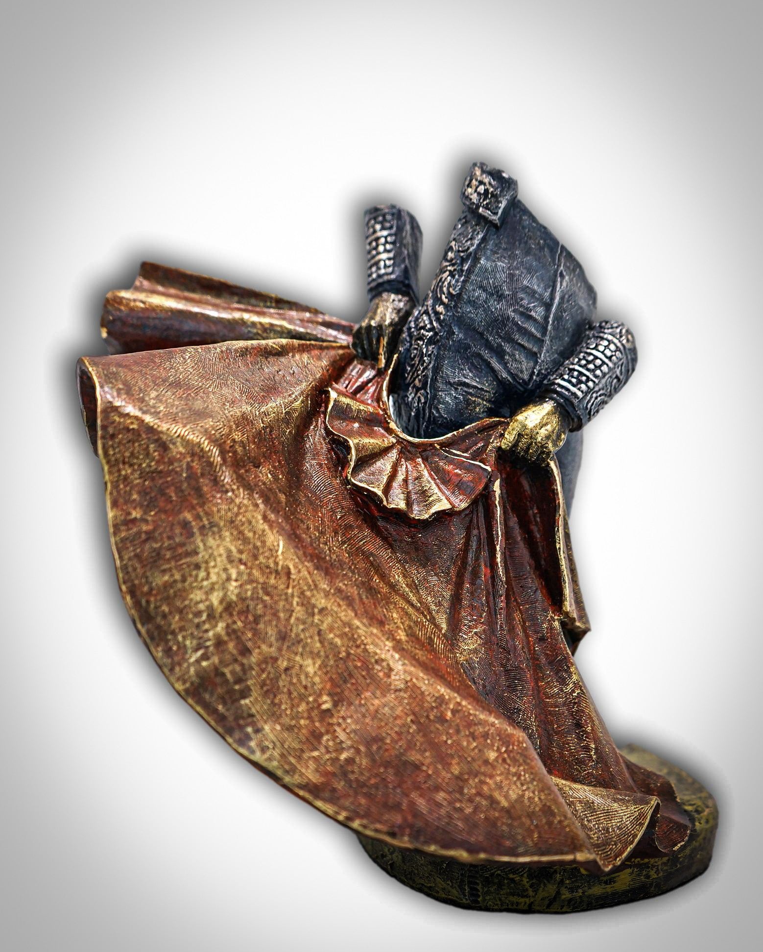 Fabricada mediante técnicas artesanales esta pequeña figura metal sería un perfecto recuerdo de España, ya que muestra a un personaje típico español en pleno desarrollo de un espectáculo llamado corrida.
