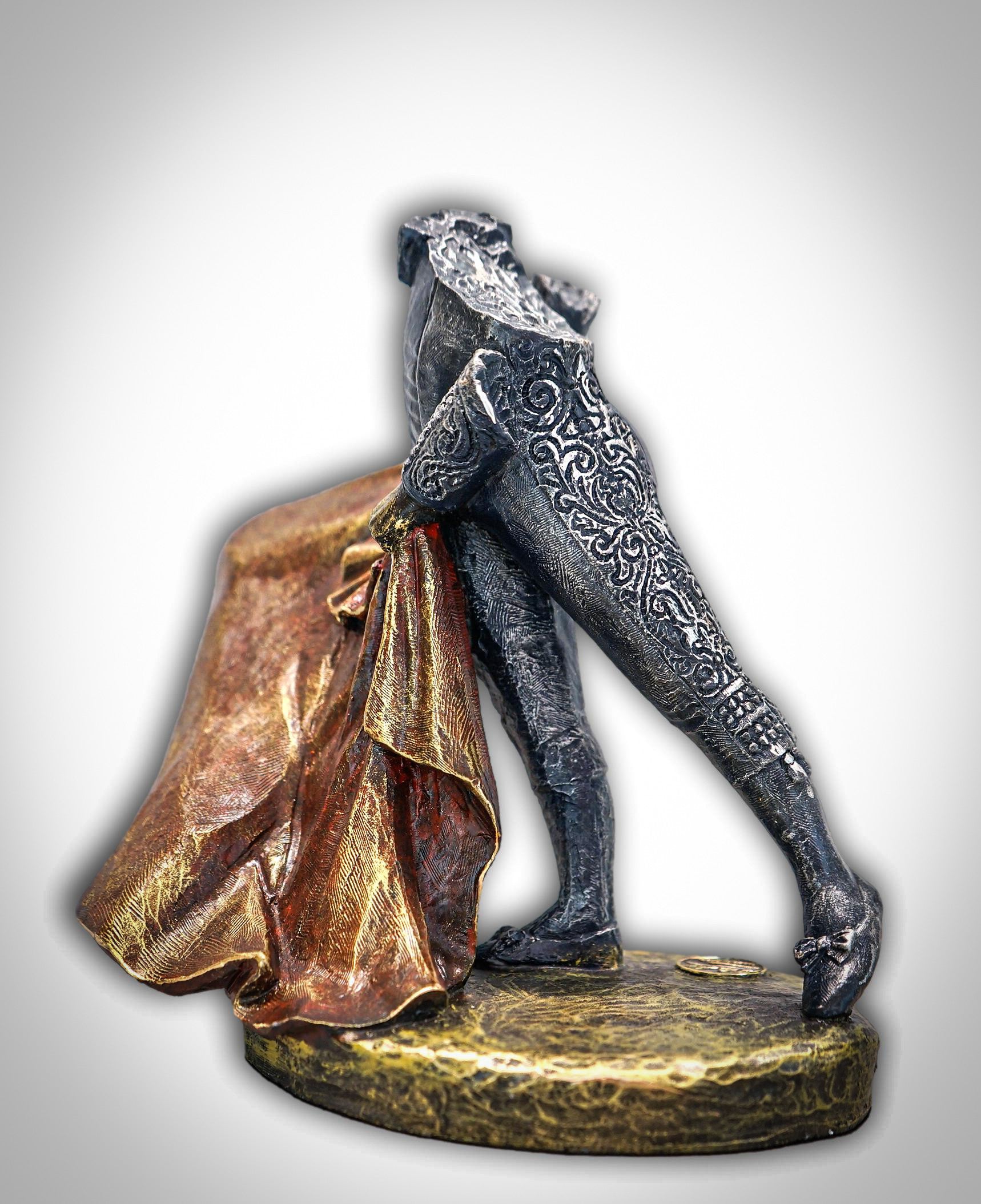 Preciosa escultura decorativa con acabado de bronce, que muestra a un torero en actitud de hacer media verónica.