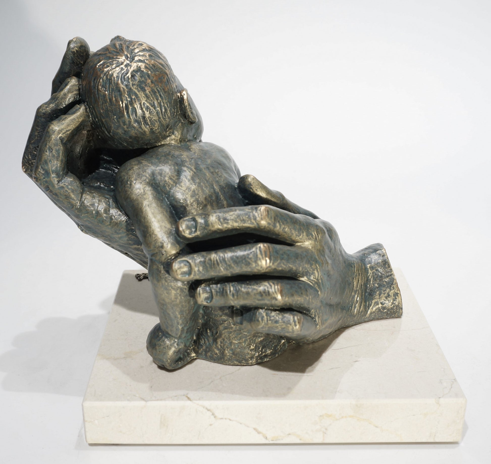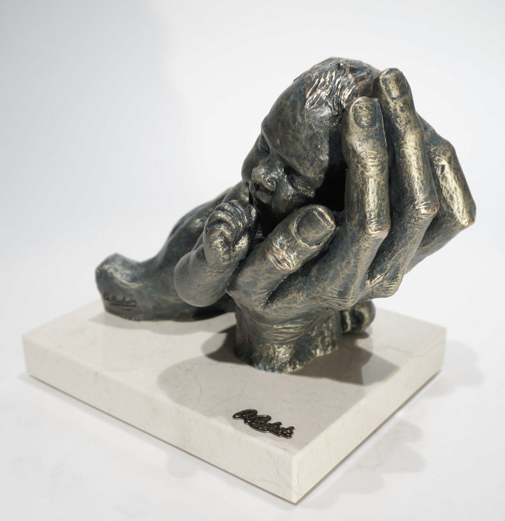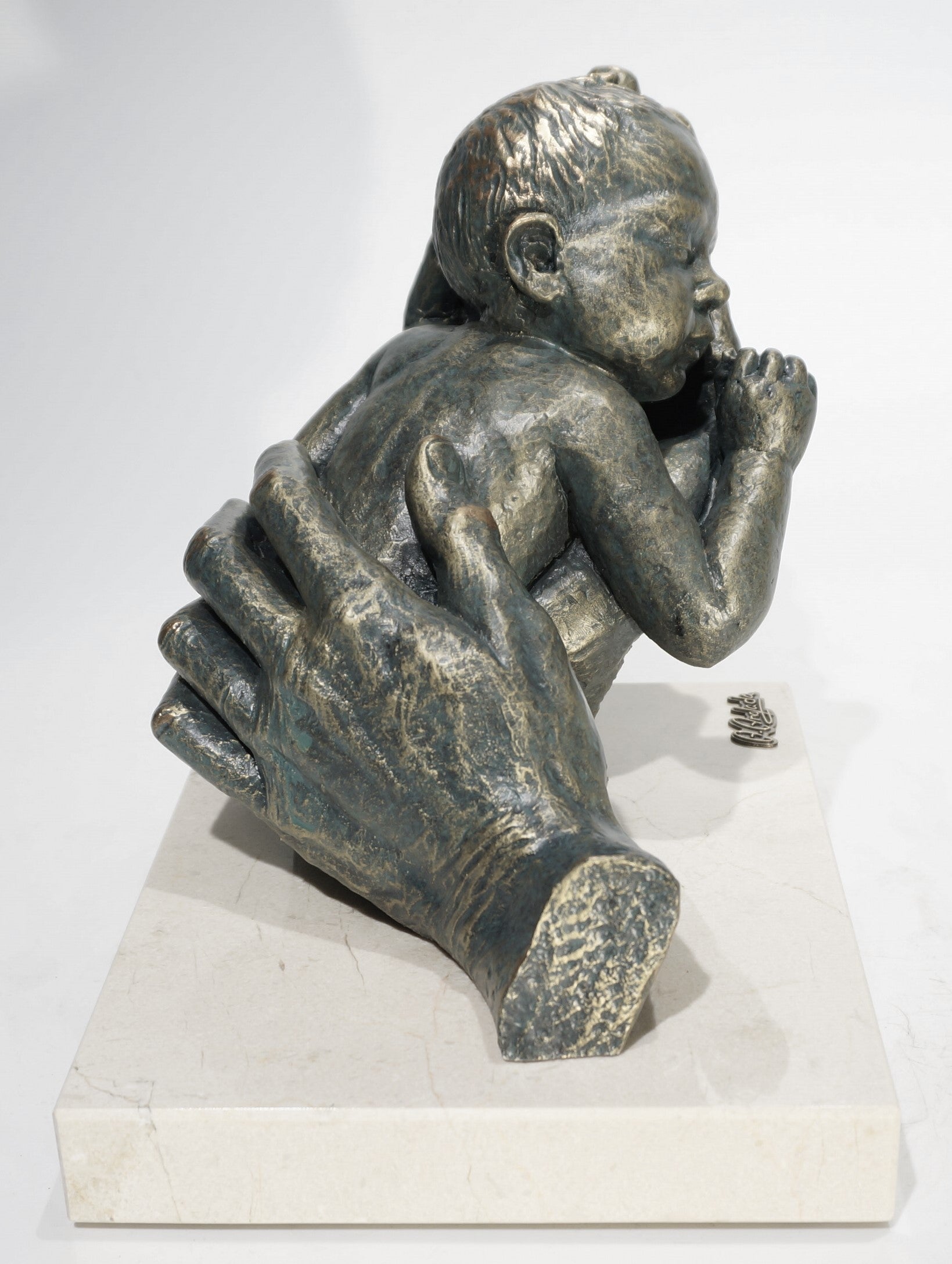 Entrañable escultura de maternidad, que representa a un bebé dormido entre las manos de su madre. Estas manos, magistralmente diseñadas por Ángeles Anglada, expresan la protección de la madre a su hijo. Podemos ver como el bebé aparece plácidamente dormido entre ellas. Esta sensación de quietud, tranquilidad y sosiego, que solo una madre es capaz de regalarnos.