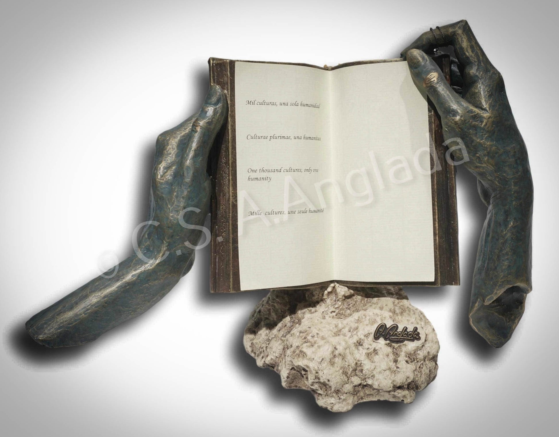“Mil culturas” es una escultura de manos que sujetan un libro abierto. La pieza hace referencia al conocimiento global que compartimos. Procedemos de distintas culturas, pero juntos formamos una única humanidad. Una humanidad construida a base de pequeños granos de arena, que cada una de las culturas del mundo han ido aportando poco a poco. No importa de dónde seas, siempre serás parte de la familia humana y podrás escribir unas palabras en este libro que recoge el conocimiento universal.