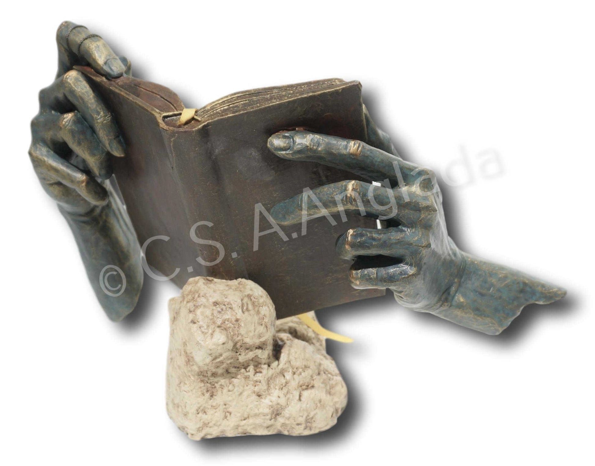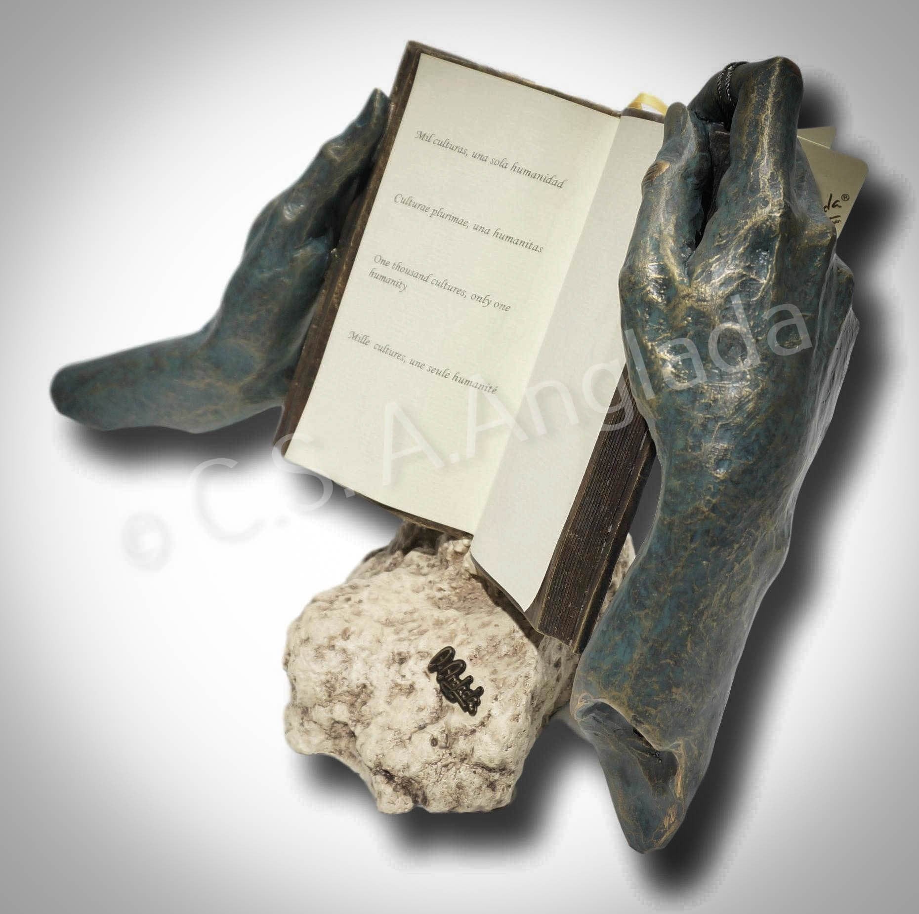 Esta decorativa escultura de manos, fue fabricada en España por la conocida escultora de Zaragoza Ángeles Anglada. Para su creación se ha empleado compuesto de cuarzo y resina, con acabado en bronce. La escultura de manos “Mil culturas” descansa sobre una peana rústica. Las dimensiones de la pieza son de 29 x 24 x 23 cm.