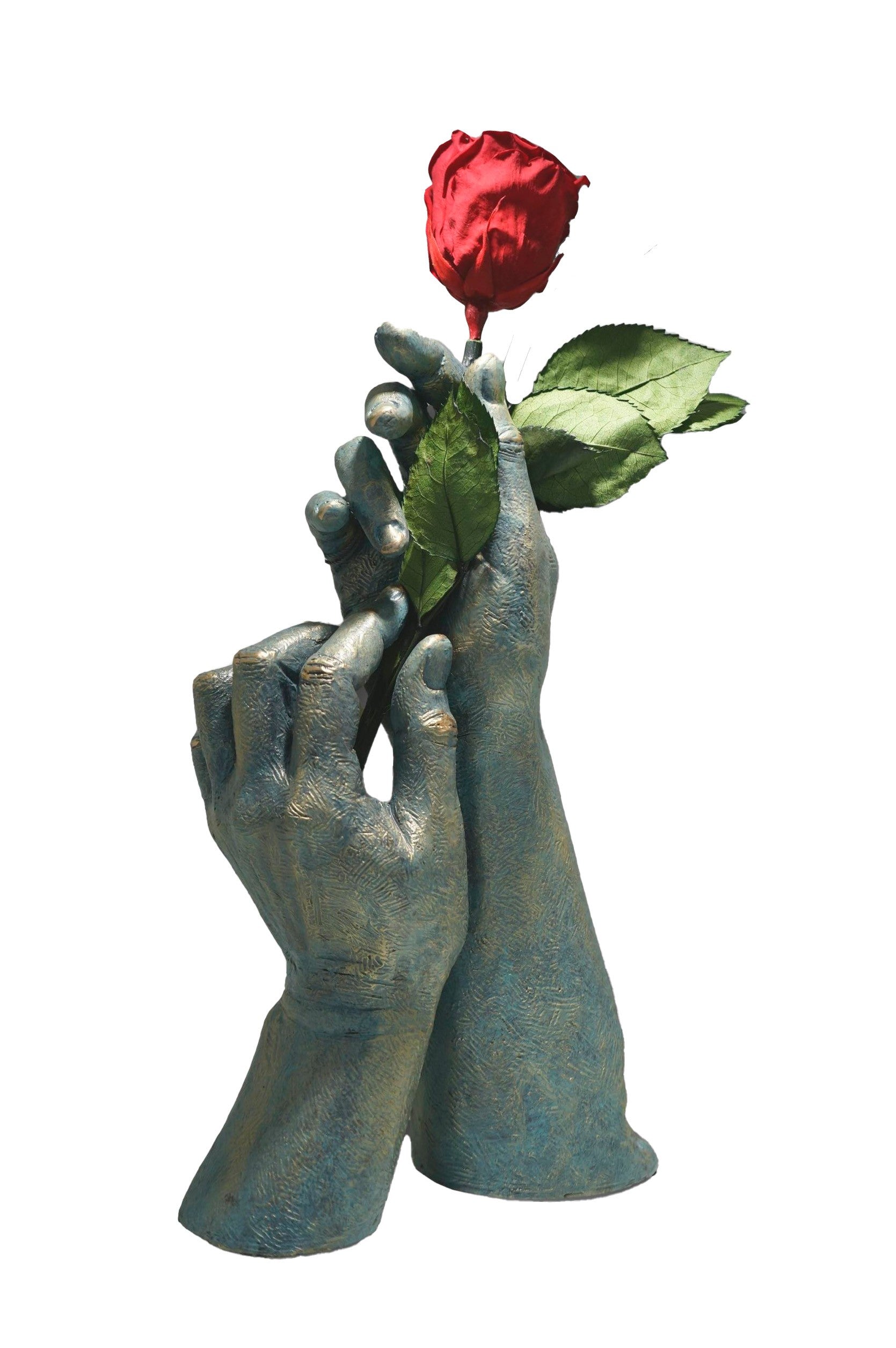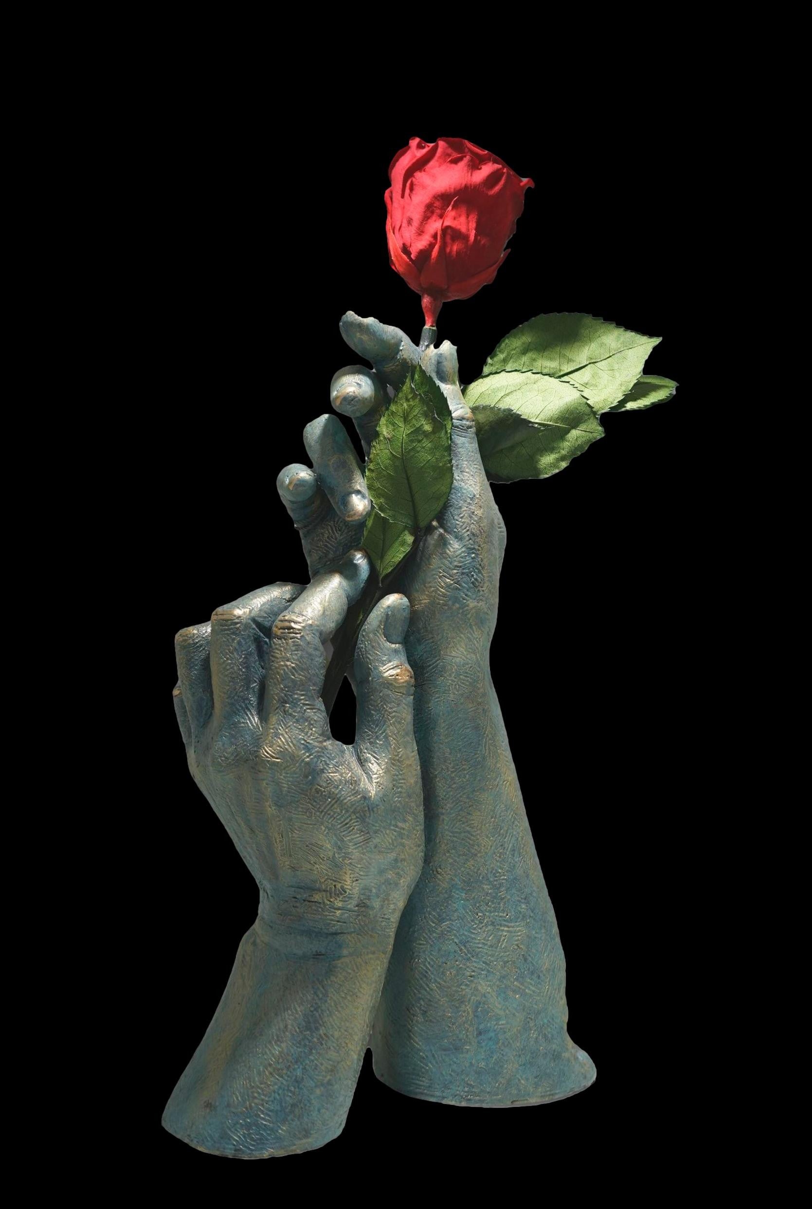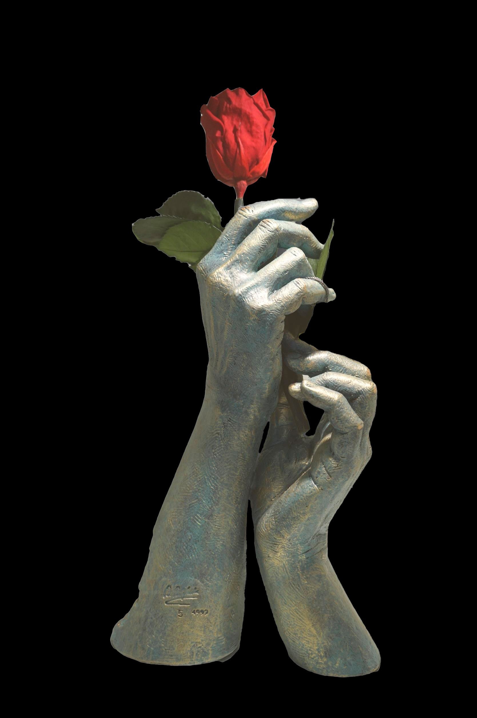 Para ti: es una escultura contemporánea. La expresión de las manos no necesitan mucha explicación. La flor, es un complemento novedoso que está incluida con la escultura. Se trata de una flor natural que ha tenido un tratamiento de liofilización, lo que permite que se mantenga inalterable. Es un elemento independiente que usted puede colocar a su criterio.