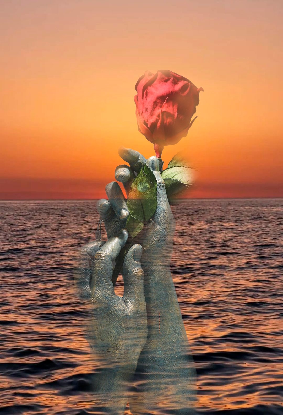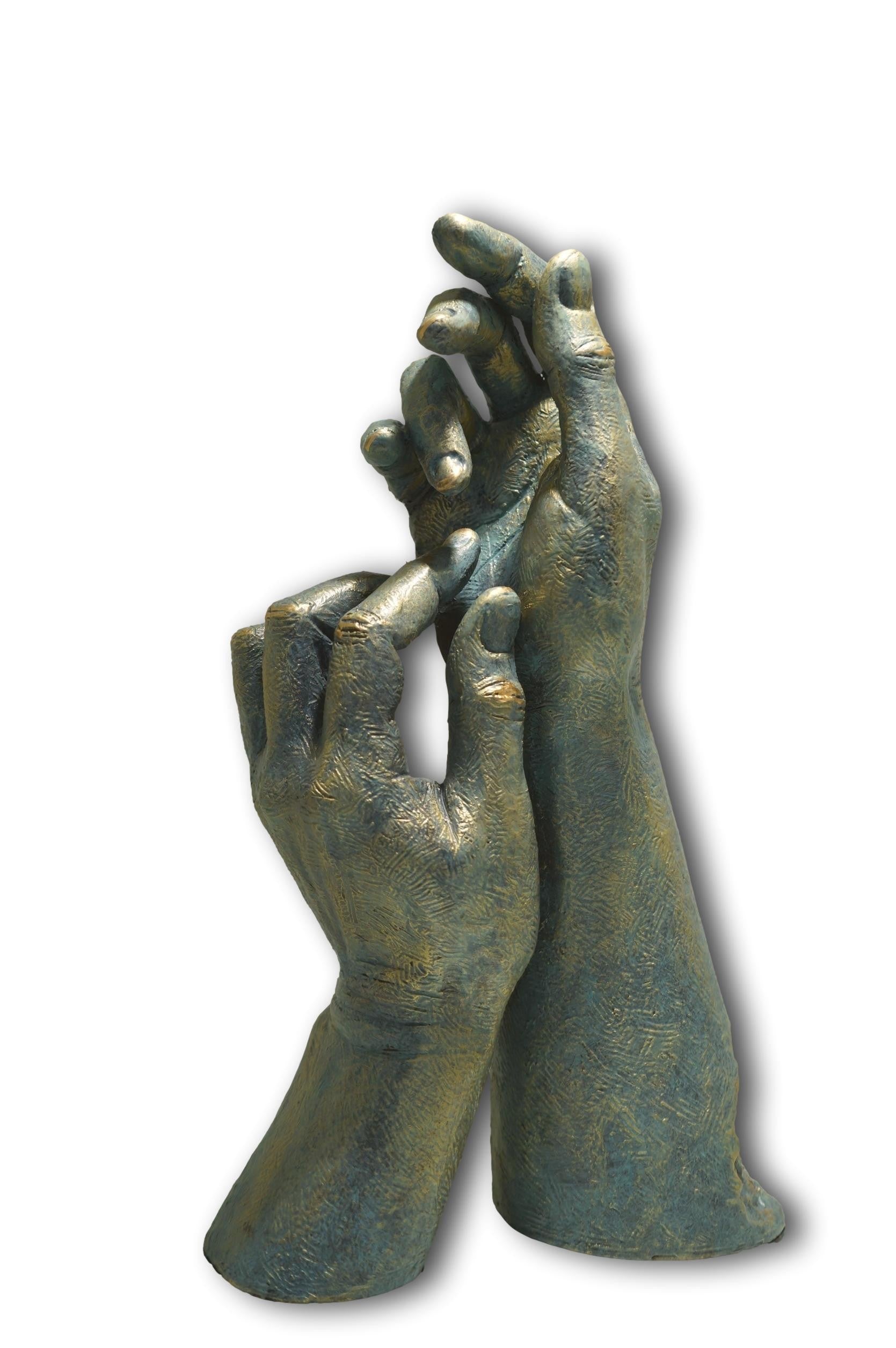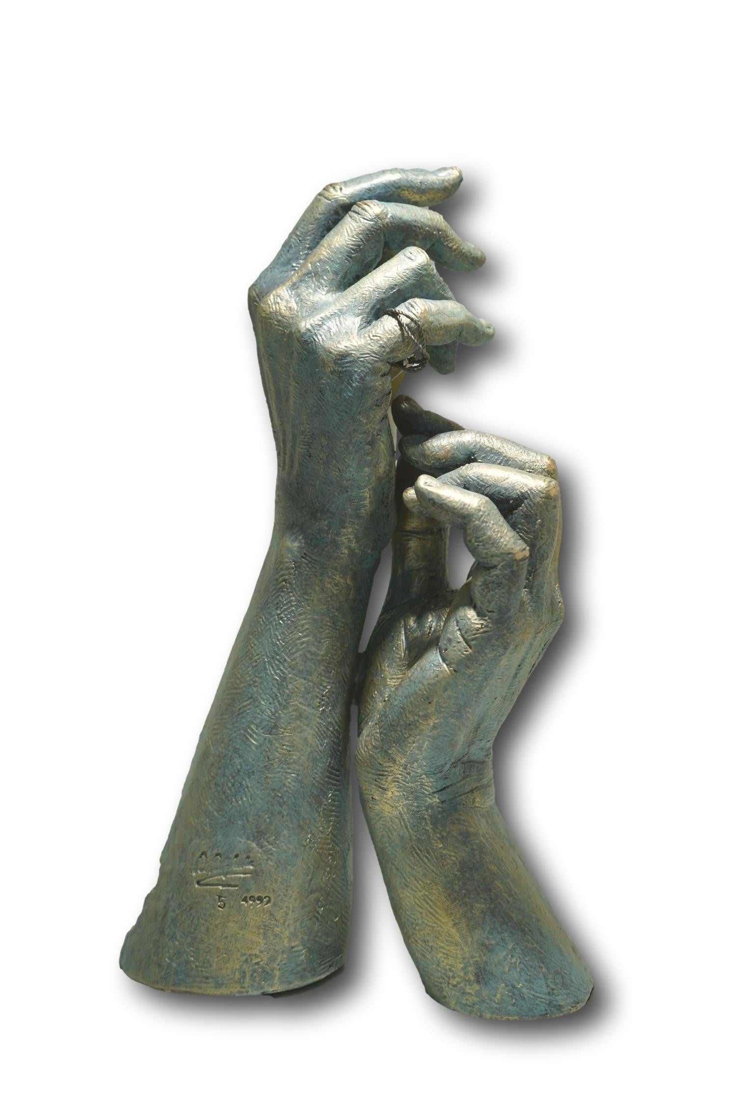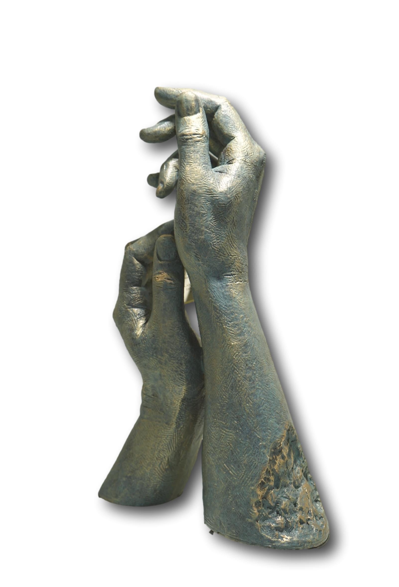 Para ti: es una escultura contemporánea. La expresión de las manos no necesitan mucha explicación. La flor, es un complemento novedoso que está incluida con la escultura. Se trata de una flor natural que ha tenido un tratamiento de liofilización, lo que permite que se mantenga inalterable. Es un elemento independiente que usted puede colocar a su criterio.