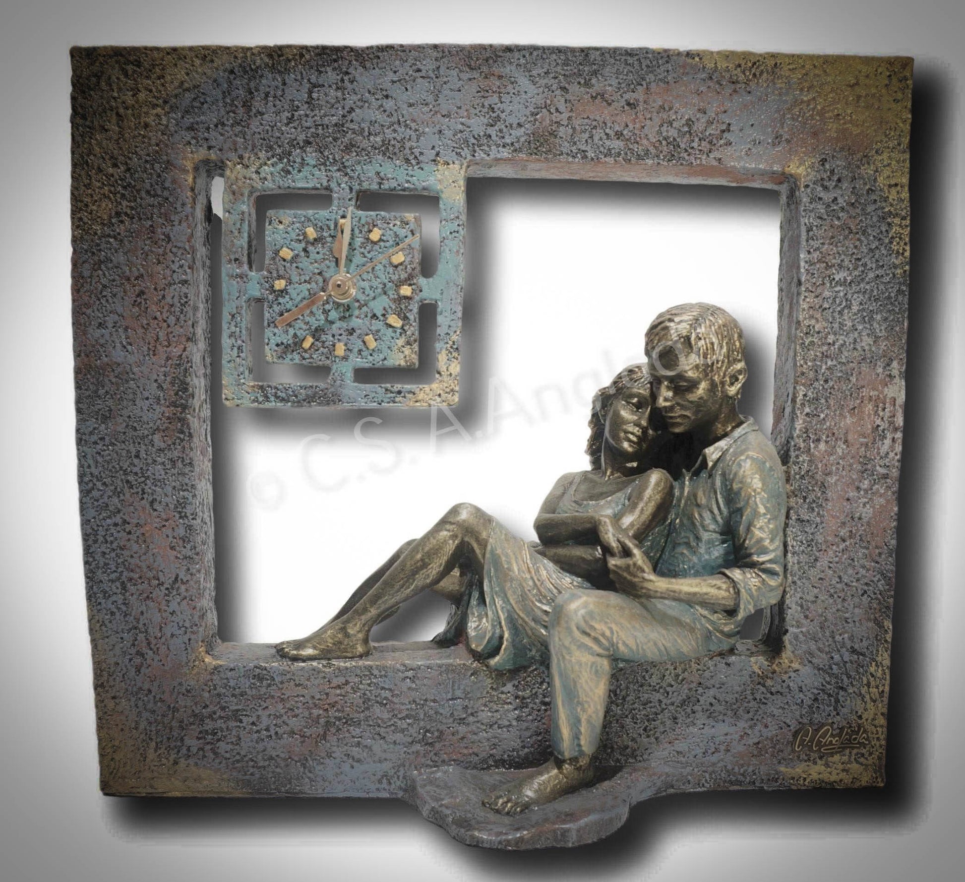 Se trata de un reloj de mesa en forma de un marco, que nos recuerda a una gran ventana de una casa, donde descansa sentada una pareja de enamorados. Ambos personajes contemplan en paisaje mientras se acarician delicadamente. Este descanso en pareja les aporta una fuerza y una energía muy especial, como si hubiese sido generada por arte de magia.