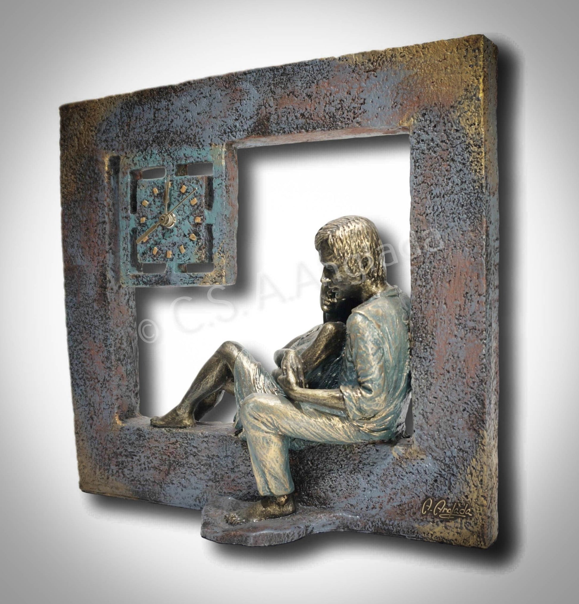 El reloj de mesa “Descanso” está fabricado en cuarzo y resina. En este, caso Ángeles Anglada ha usado bronce patinado como acabado para las figuras de la pareja, y óxido para el marco del reloj. Las dimensiones de la pieza son de 35 X 15 X 31 cm