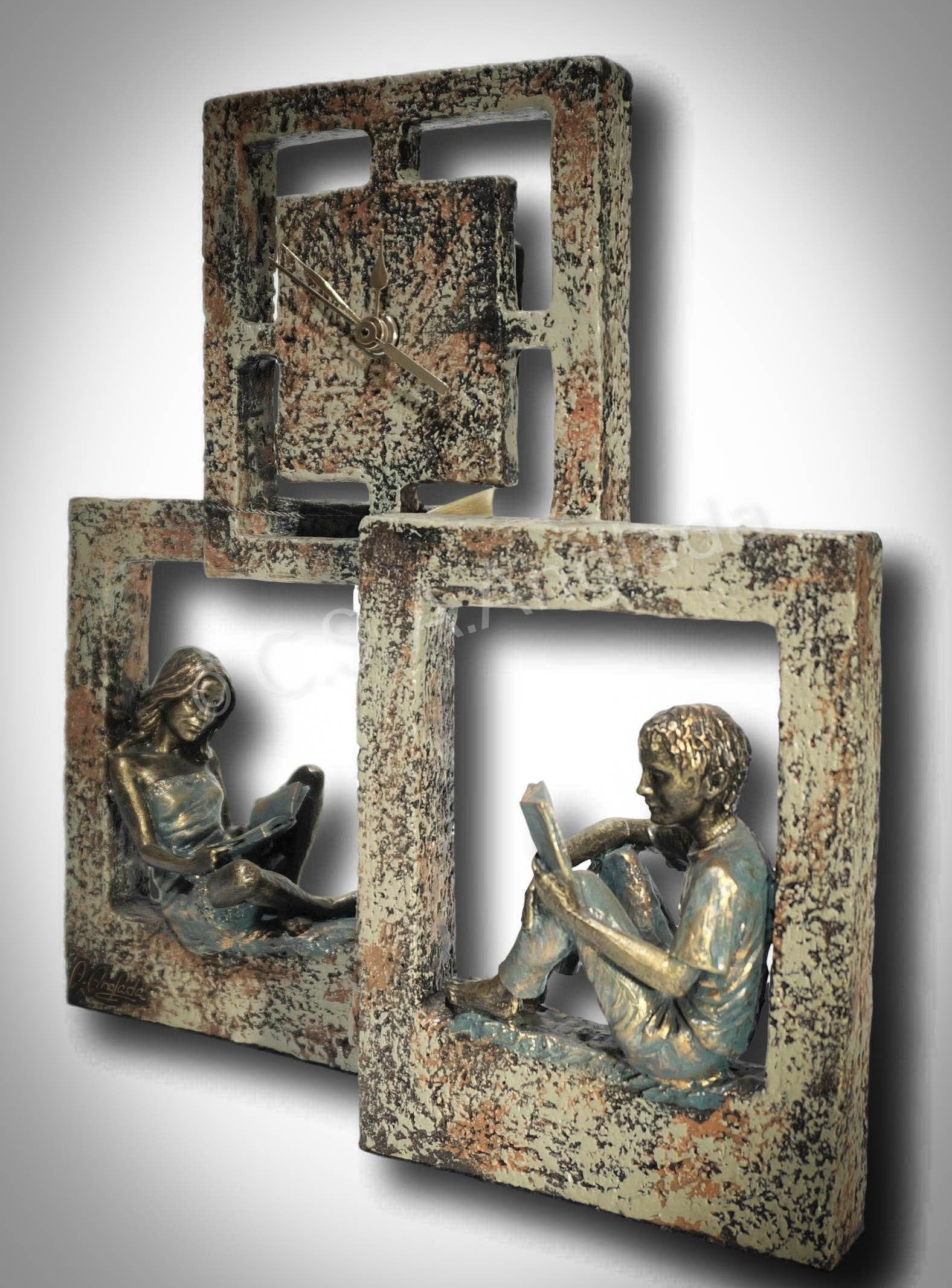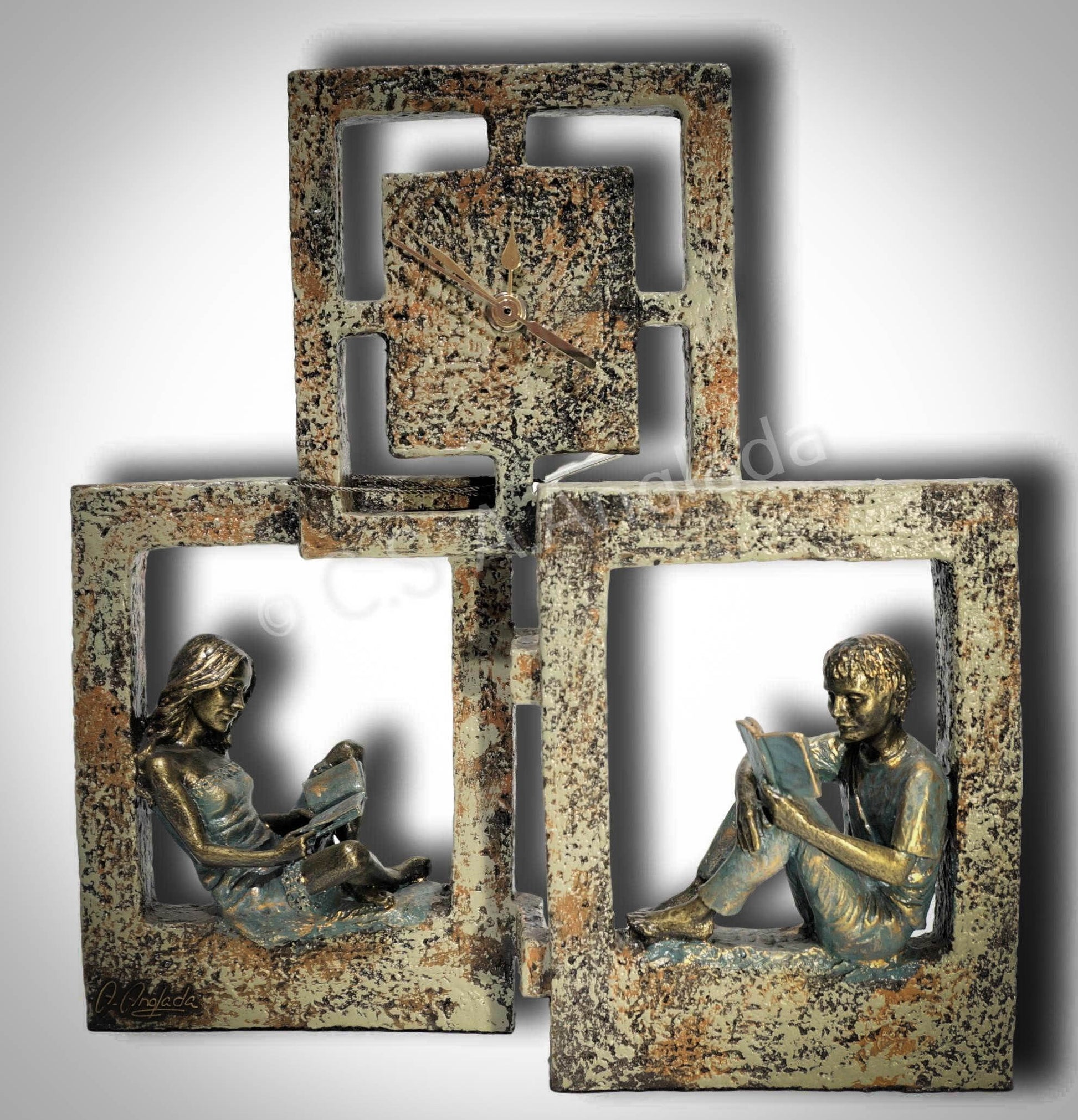 Se trata de un reloj de mesa de tipo escultura, que hace referencia a como el tiempo parece detenerse cuando estamos disfrutando de un buen libro. Es increíble como el poder de las palabras, cuando se tiene el don de manejarlas con arte y maestría, son capaces de transportarnos a otros lugares, a otros mundos de fantasía, a tiempos pasados, y convertirnos en protagonistas de historias maravillosas.