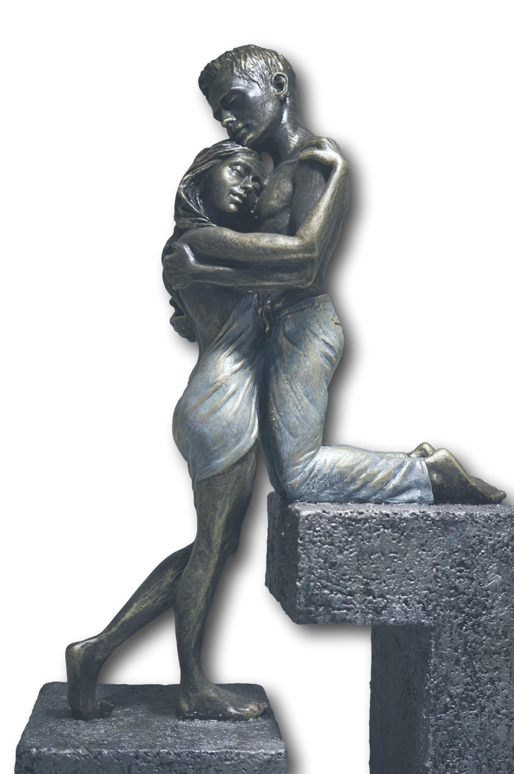 Bonita escultura de la categoría de parejas tratada con baños de diversos metales y patinas para conseguir el acabado bronce y tonos verde-azules.