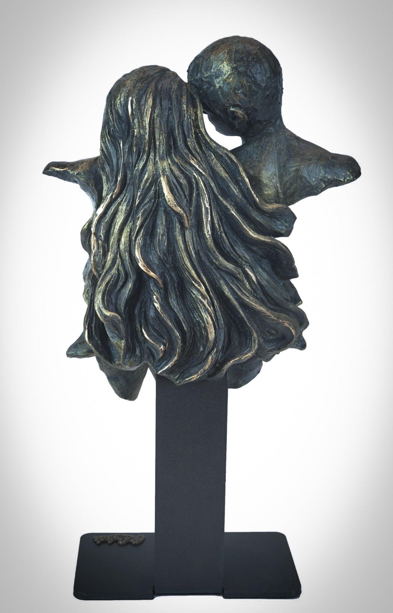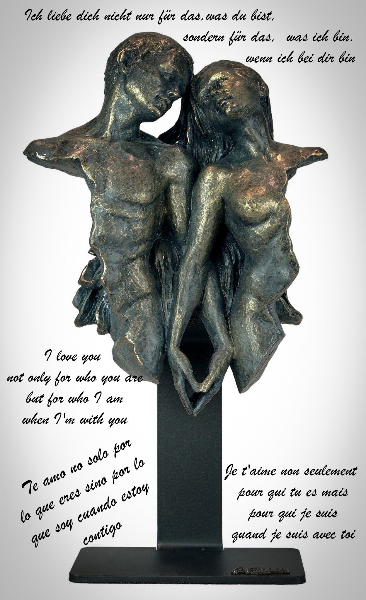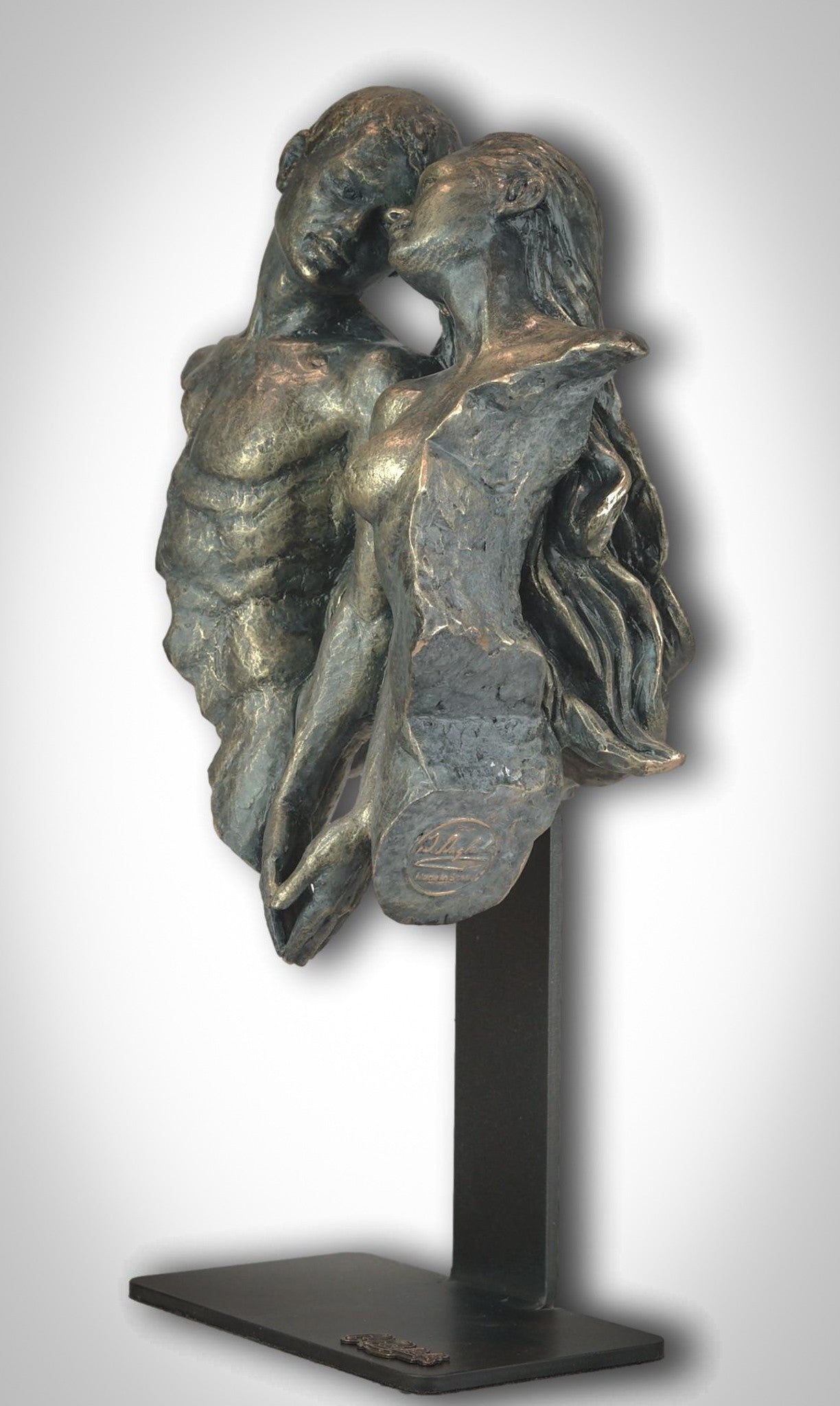 Escultura moderna de amor, que sería ideal para un regalo de boda o regalo de aniversario. Su diseño elegante y original se remata con un soporte de hierro que le da un toque moderno y minimalista. La escultura se integrará perfectamente en cualquier espacio, ya sea de estilo moderno o clásico. Así que puedes estar tranquilo, seguro que les gustará a los novios tu regalo de boda. Las técnicas artesanales, que usa la diseñadora Ángeles Anglada hacen a esta escultura todavía más valiosa a nivel estético.