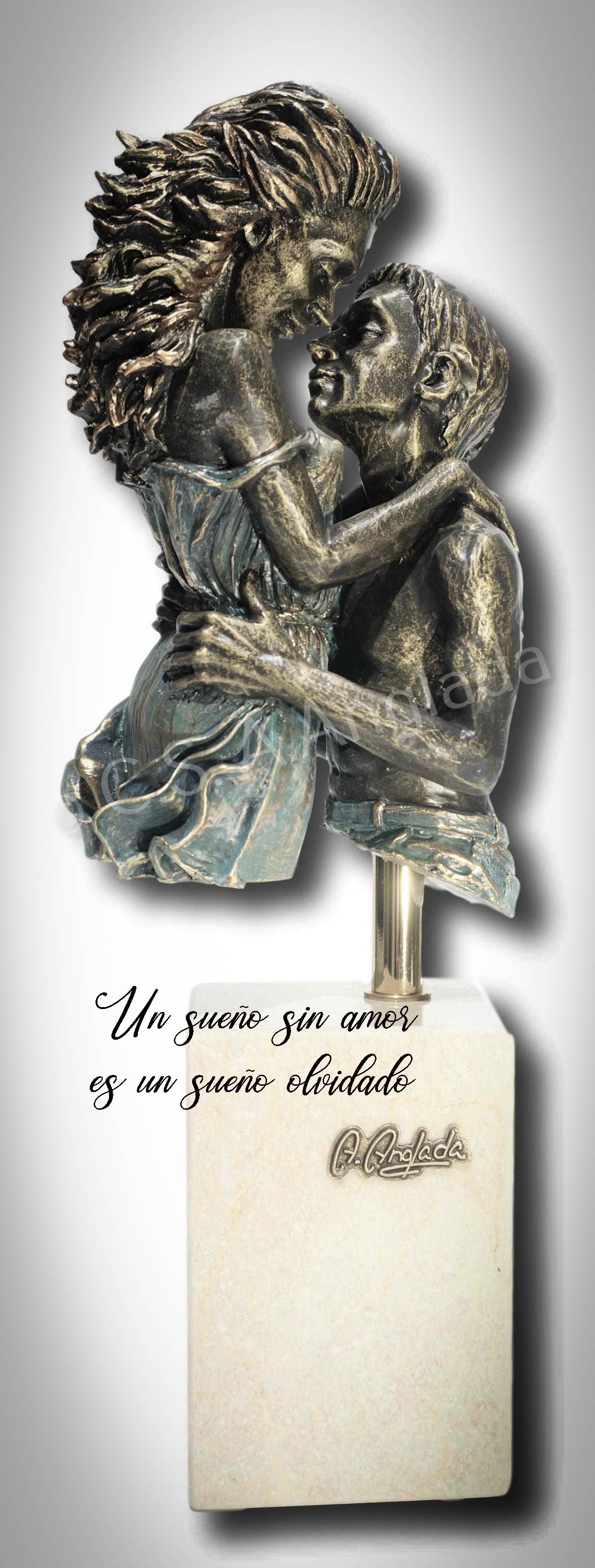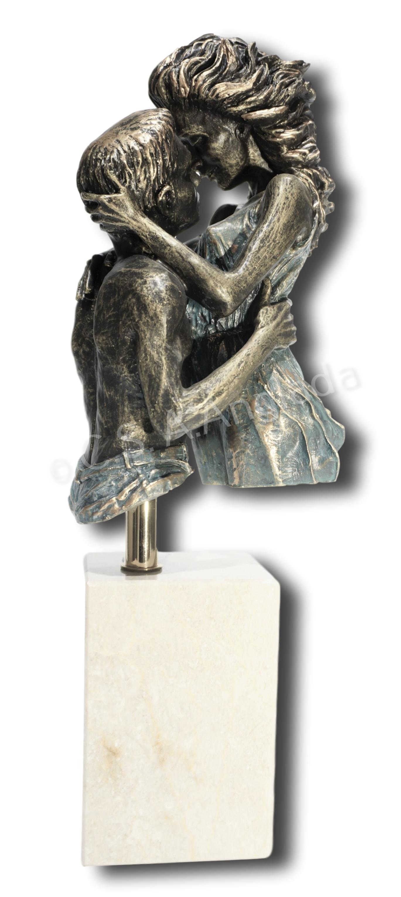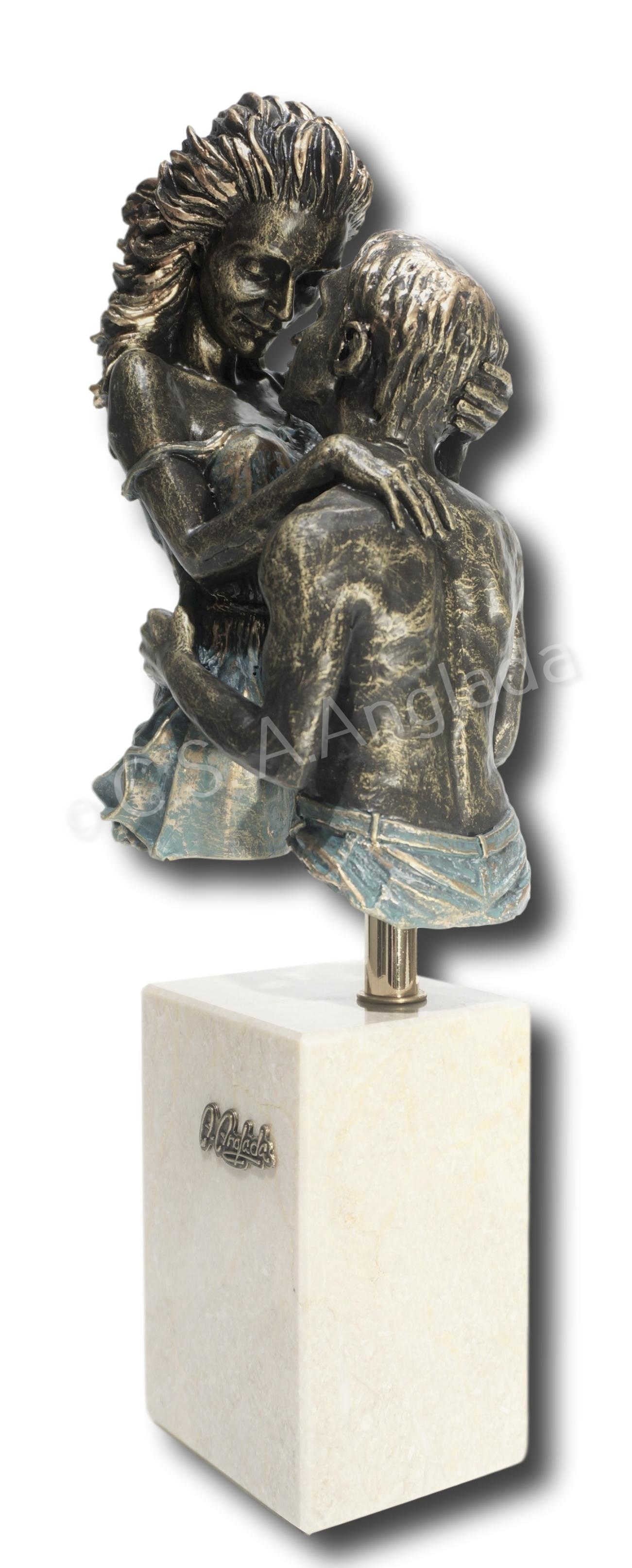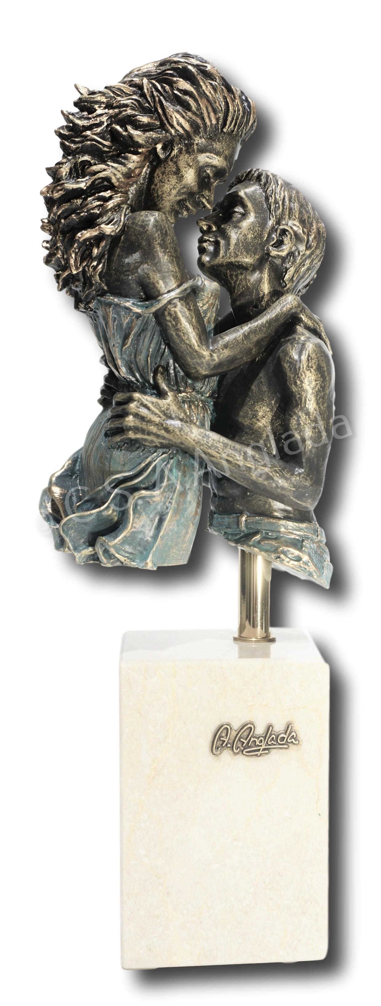 La escultura de pareja “Impulso” representa a una pareja jóvenes impetuosos. El chico, conducido por un repentino impulso provocado por sus sentimientos, levanta a la chica por encima de su cabeza. Parecen estar girando como si fueran niños. La chica se inclina ligeramente hacia su pareja para darle un beso. Esta escultura de gran valor estético podría encajar en cualquier espacio de tu casa.