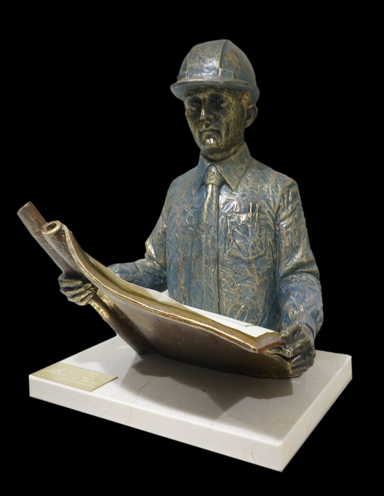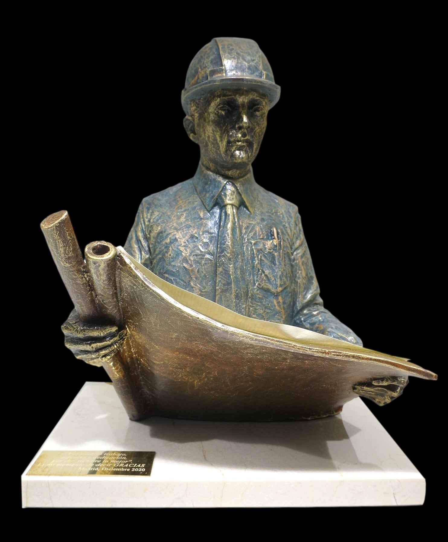 Escultura de estilo realista que representa a un ingeniero, arquitecto o aparejador. Sin duda, todas estas profesiones son muy importantes y más que dignas de nuestro respeto. Son los responsables de cómo son nuestras ciudades, nuestras casas, de como nos movemos de un lugar a otro en el mundo, en definitiva, son los responsables en gran medida de nuestra calidad de vida. Un puente mal construido puede costar vidas y esto es solo un pequeño ejemplo de la enorme responsabilidad que tiene un ingeniero o un arquitecto sobre sus hombros. Por ello, Ángeles Anglada ha representado a este profesional con la mirada llena de sabiduría, la mirada pensativa de una persona analítica y con un gran conocimiento.