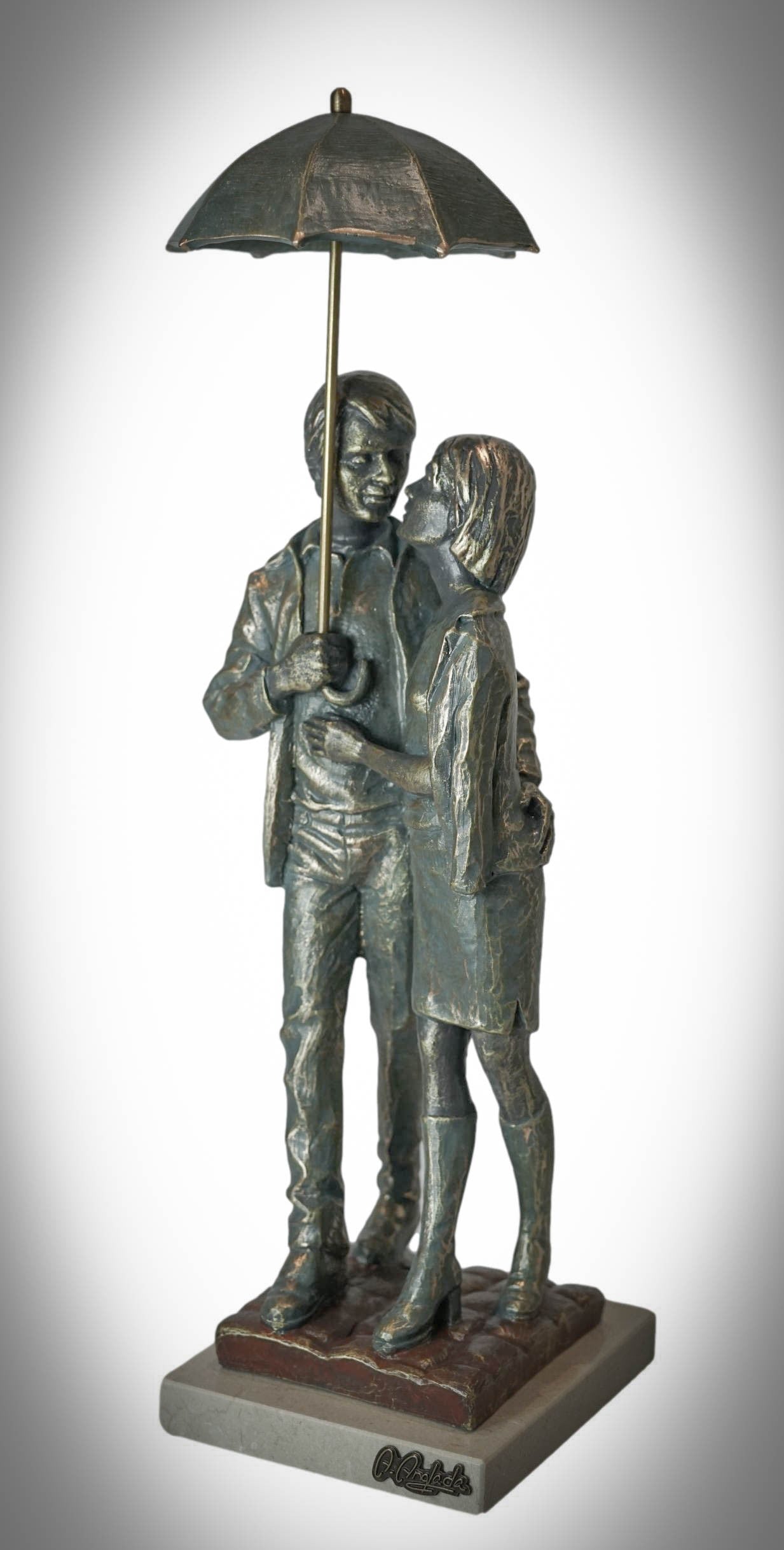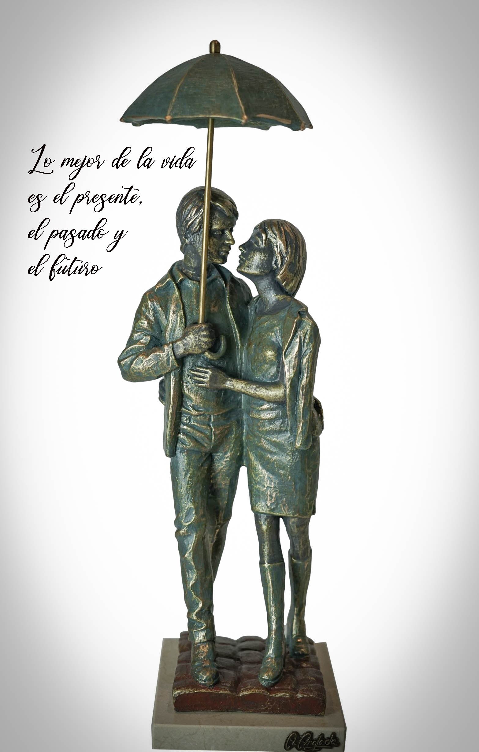 Esta escultura de pareja representa la que posiblemente sea la época del año más romántica, el otoño. La estación que nos trae los primeros fríos del año, acompañados de sus lluvias y un cierto toque de melancolía. Pero a estos dos personajes de la escultura parece no importarles lo más mínimo. Ellos permanecen felizmente inmutables, y es que las inclemencias del tiempo no suponen un problema siempre que estén juntos. Esta escultura realista es una perfecta representación de amor que podría ser un regalo de boda original.