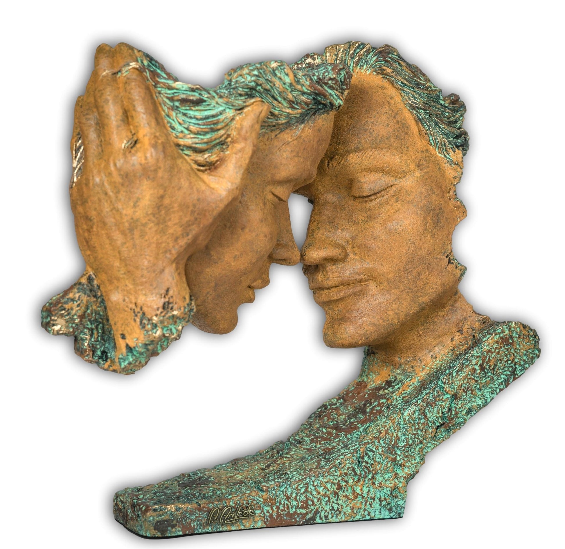 La escultura de pareja “Pretexto” es una preciosa muestra de amor inmortalizada en cuarzo y resina, con diversos baños de aleaciones metálicas. La famosa diseñadora Ángeles Anglada, ha envejecido su obra para conseguir múltiples efectos. En el acabado predominan el óxido Cor-ten y el óxido de cobre. En el pelo de los personajes resaltan toques dorados de latón, que crean la sensación mágica que trasmite la escultura. Los personajes parecen estar soñando, quizás en su propio mundo.