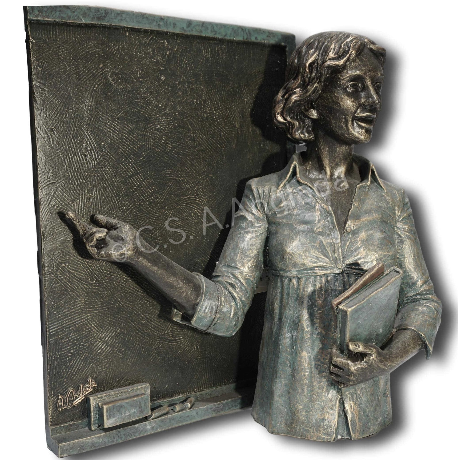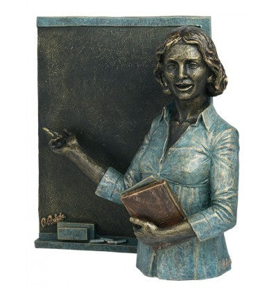 Te ofrecemos una de las maravillosas y realistas esculturas de Ángeles Anglada. Se trata de una representación de una profesora impartiendo una clase magistral y haciendo uso de su tradicional pizarra. Esta obra pretende ser un homenaje a esta profesión tan importante y trascendente para la sociedad. Ser profesor es mucho más que un simple trabajo, sobre todo es un don. Un don maravilloso que solo unos pocos poseen, el don de poder trasmitir sus conocimientos a otra persona. Ser profesor también implica poseer una paciencia y un amor incalculable hacia la enseñanza y hacia las personas, ya que, y creo que todos estaremos de acuerdo en esto, nosotros no siempre somos unos alumnos perfectos y nuestras travesuras infantiles no siempre fueron tan inocentes.