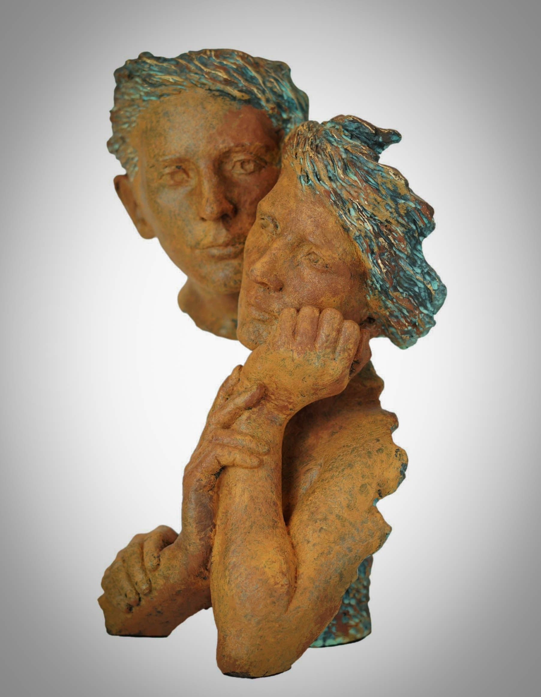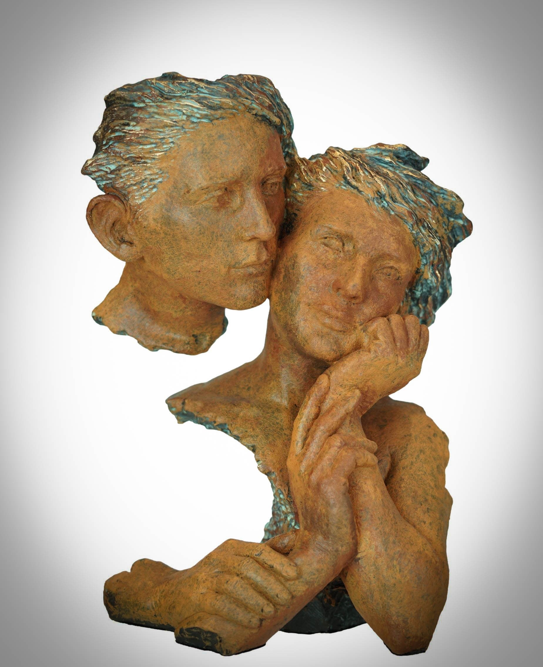 Esta escultura de pareja, destaca por su original composición escénica, así como por su acabado en tonos en óxido y azules. La escultura ha querido representar con esta obra, un momento de reflexión de esta joven pareja, en el que conversan larga y pausadamente sobre todos los sueños y anhelos que tienen ambos en común.